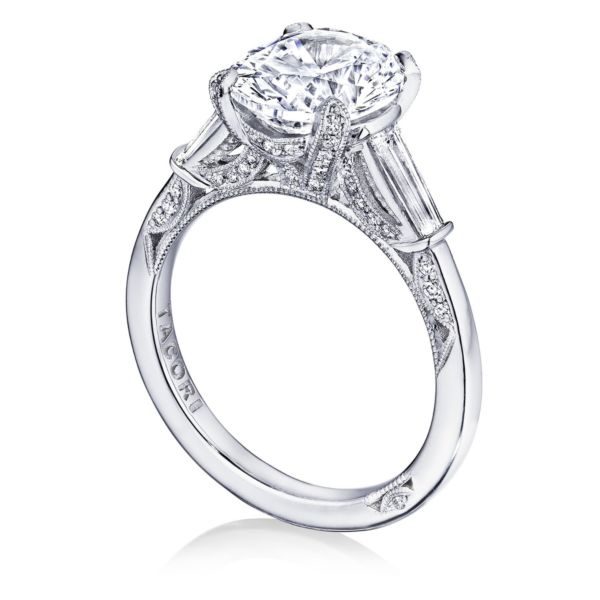 TACORI ROUND 3-STONE ENGAGEMENT RING WITH TAPERED BAGUETTE SIDES RING. THE DIAMONDS HAVE A TOTAL WEIGHT OF 0.67 CARATS (NOT INCLUDING CENTER) VS CLARITY G COLOR SIZE 6.5. SERIAL 527787