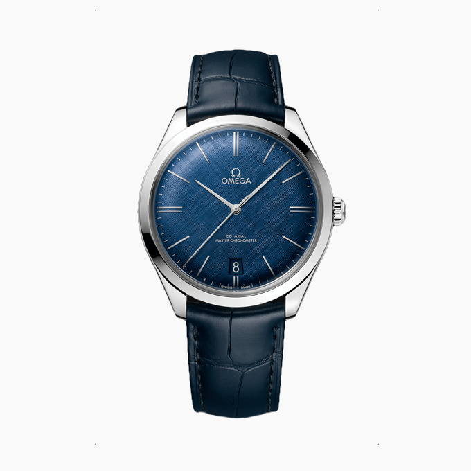 Omega 40 mm De Ville Tresor Automatic Co-Axial Master Chronometer in stainless steel with a Blue dial on a Blue Alligator strap.