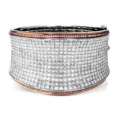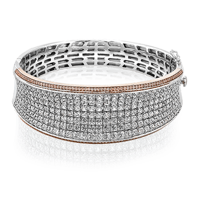 Offering a distinctive contemporary style, this bangle bracelet is white and rose gold is accented by an astounding 18.85 ctw princess cut white diamonds and .79 round pink diamonds.