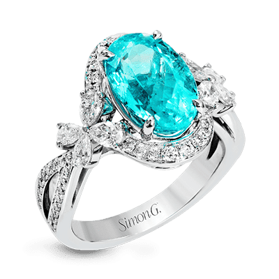 This ring is truly extraordinary, centering around an incredibly bright 4.04 ctw paraiba tourmaline. This is surrounded by .31 ctw of round diamonds and .66 ctw of pear shaped diamonds set into nature inspired elements crafted in 18k white gold.