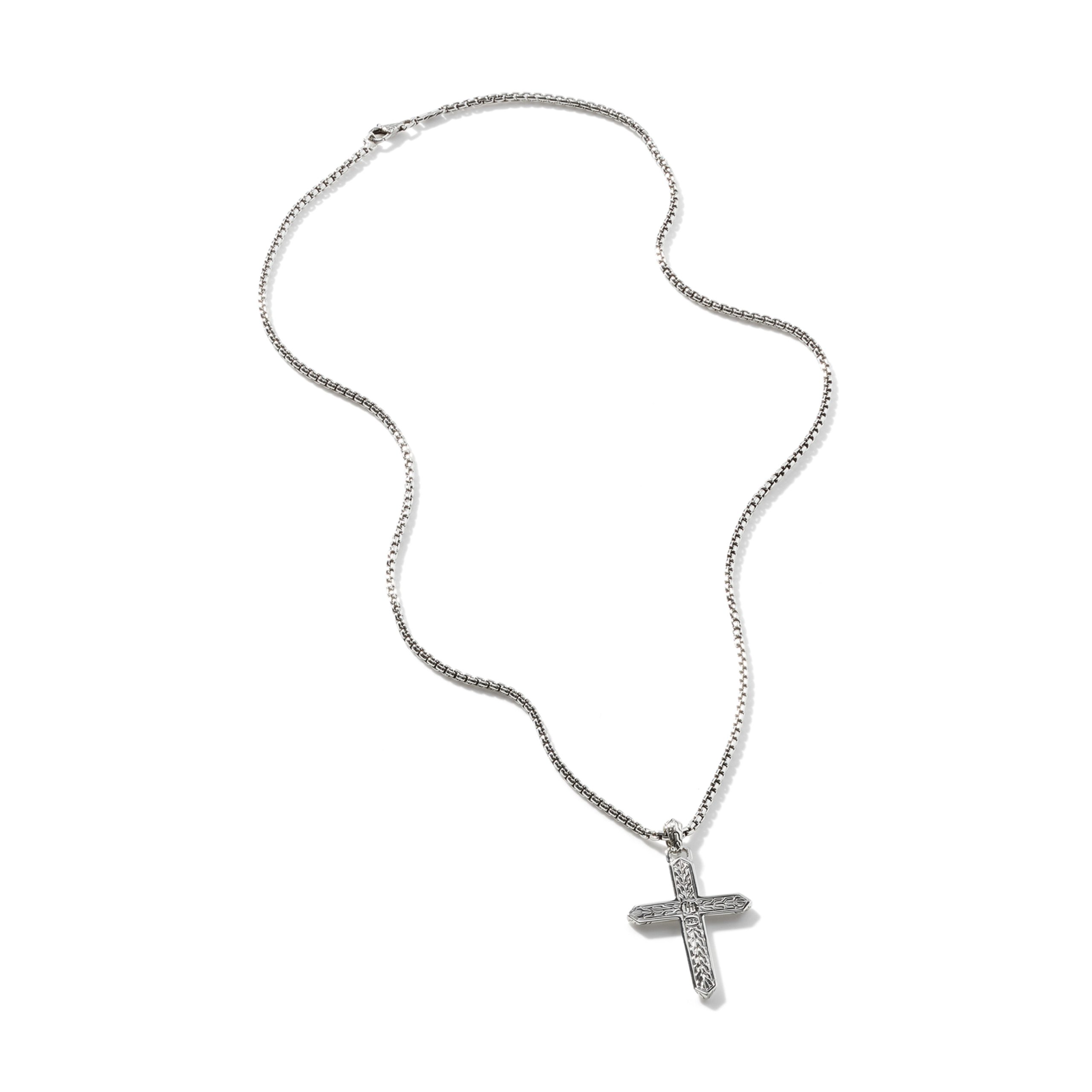 Carved Chain Silver Cross Pendant on 2.7mm Box Chain Necklace, Size 22