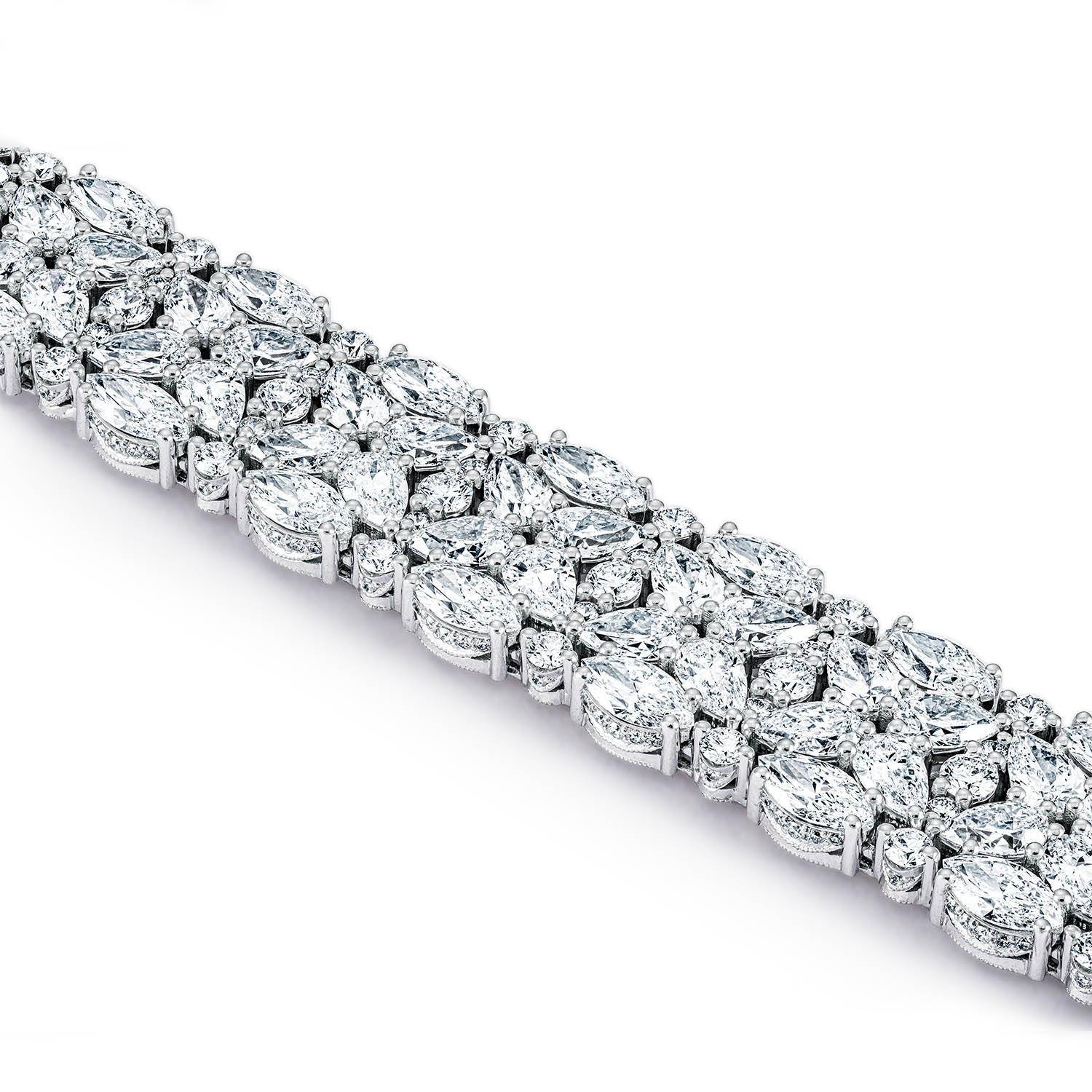 Over 30 carats of fancy-cut diamonds are arranged in an intricate mosaic, creating a totally diamond-paved surface. The design is set into an 18kt White Gold band.