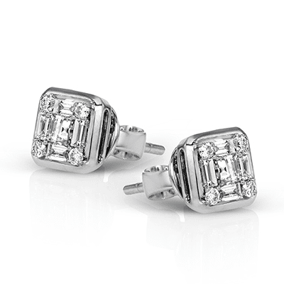 This 18k white gold earrings are a wonderful modern take on a classic diamond stud earring. They contain .06 ctw round diamonds, .12 ctw princess cut diamonds, and .15 ctw of baguette diamonds.