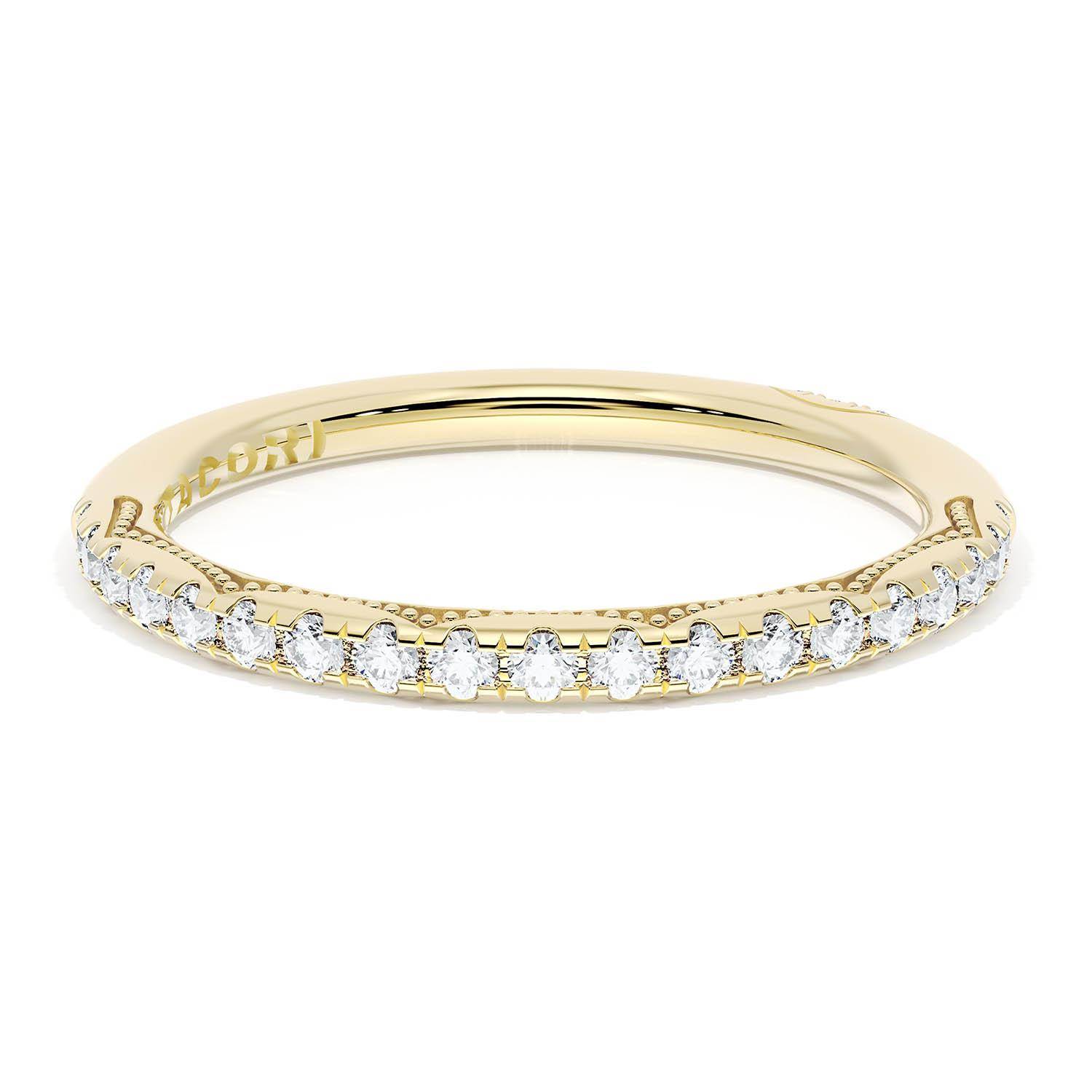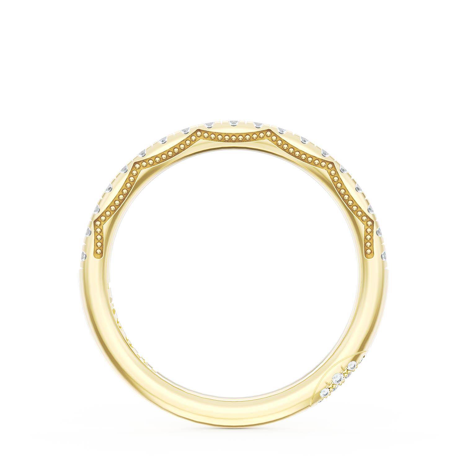 Alternating carré and round brilliant diamonds are bezel set into a high polish 18kt Yellow Gold band. Hand-hewn beading and meticulous milgrain add texture to the inner face silhouette.