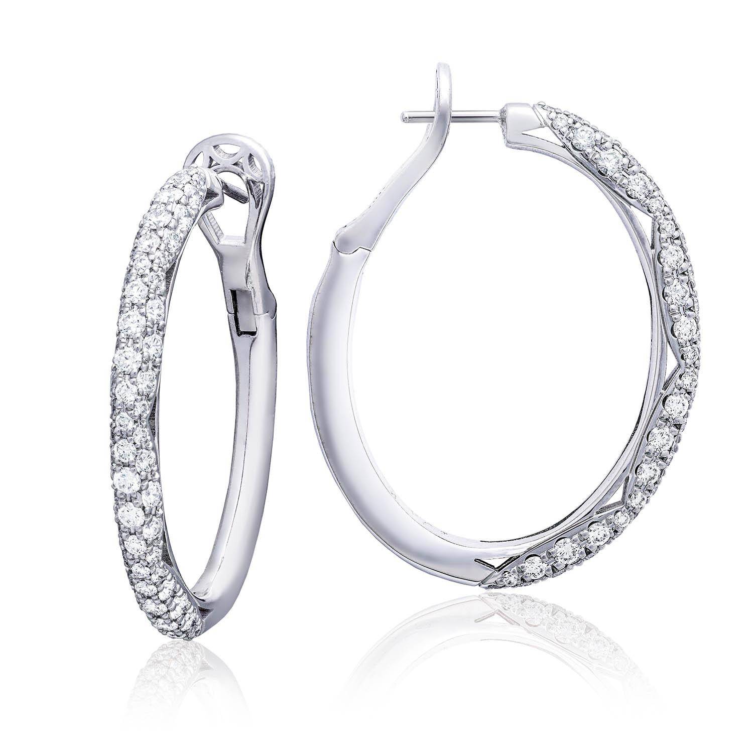 These solid 18 Karat White Gold diamond hoop earrings wrap front to back and are adorned with meticulously a full 2.45 carats of hand-set round brilliant diamonds, set into subtle TACORI Crescent silhouettes.