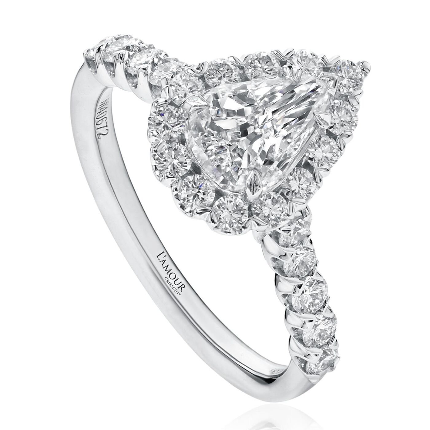 Christopher Designs engagement ring with .84ct LAmour Crisscut® Pear diamond center. Halo design features round cut diamonds falling half way around the finger .66cttw set in 18K white gold.