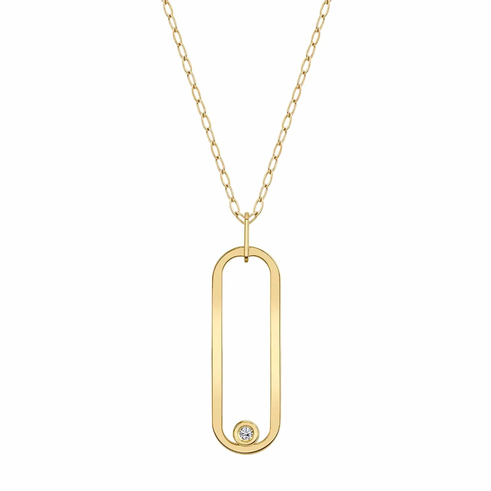 Stretch it out. Do it your own way. Elongated 14k gold flat link with a bezel set diamond hangs heavy at the end of a 30″ chain.