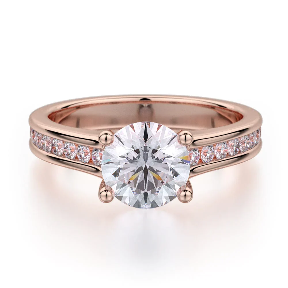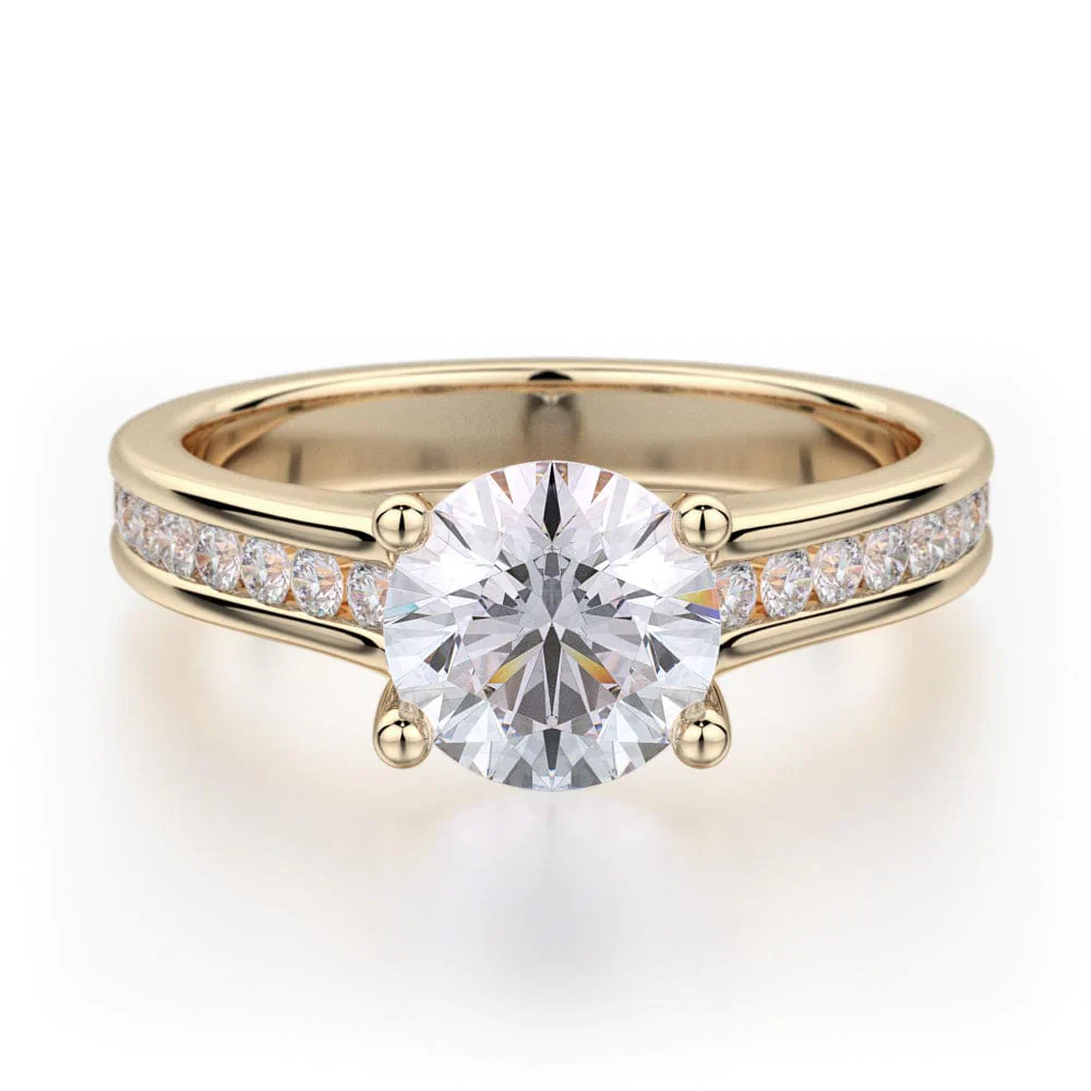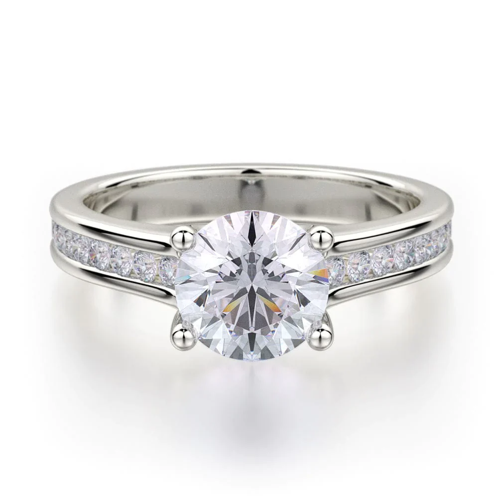 The sleek frame of LOVE R461-1 features a gentle row of channel-set diamonds and a floating prong-set center stone. The round center diamond and slim design of this MICHAEL M ring create a tasteful luster.