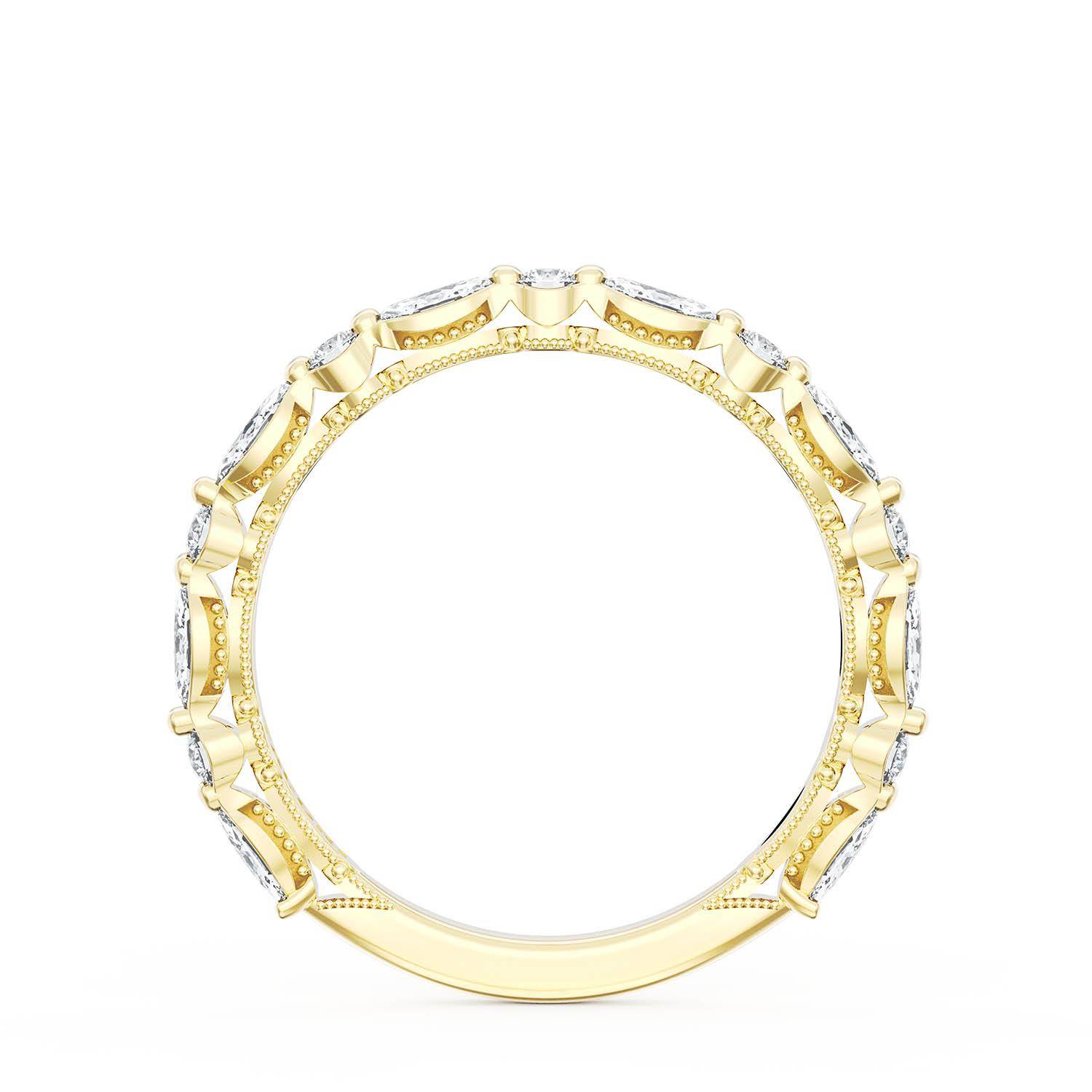 Alternating marquise and round brilliant diamonds are bezel set into a high polish 18kt Yellow Gold band. Hand-hewn beading and meticulous milgrain add texture to the inner face silhouette.