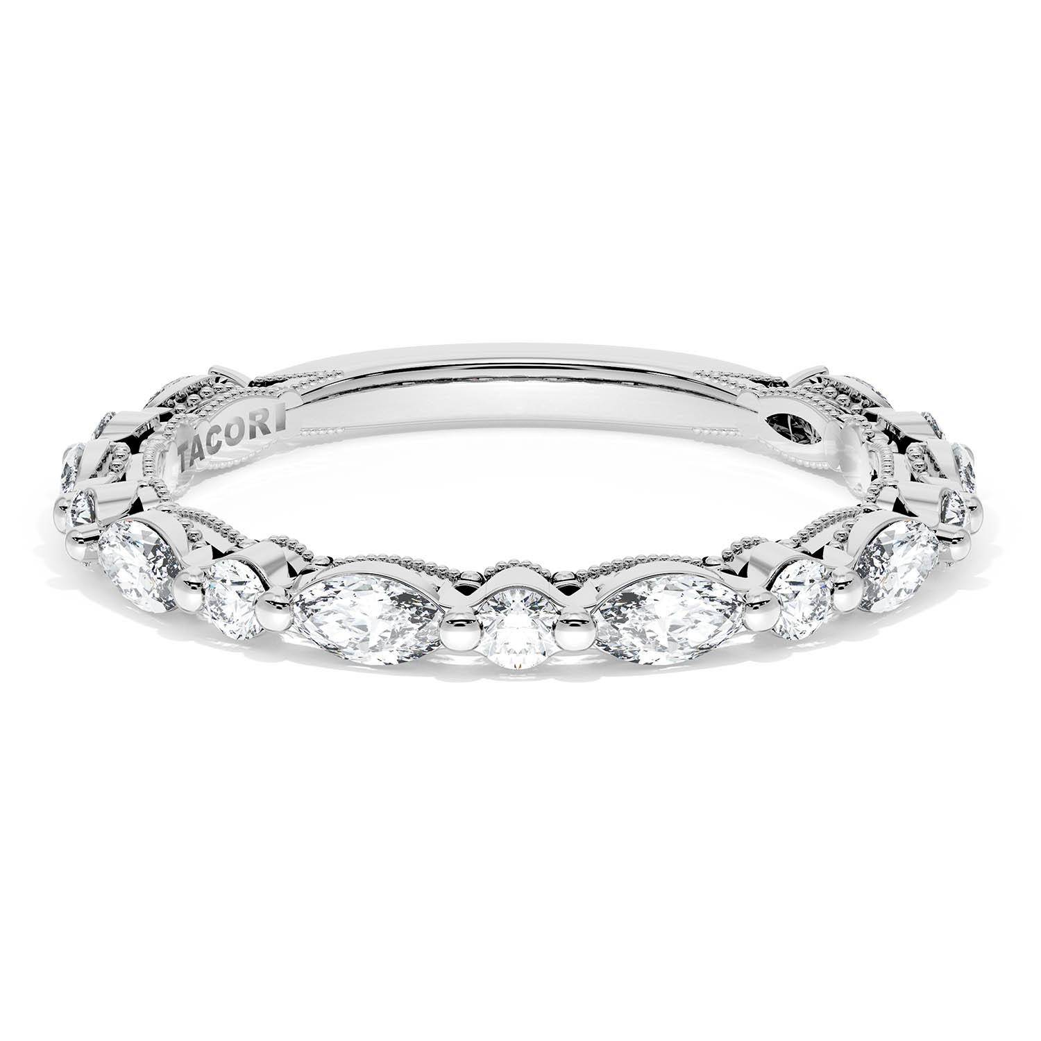 Alternating marquise and round brilliant diamonds are bezel set into a high polish 18kt White Gold band. Hand-hewn beading and meticulous milgrain add texture to the inner face silhouette.