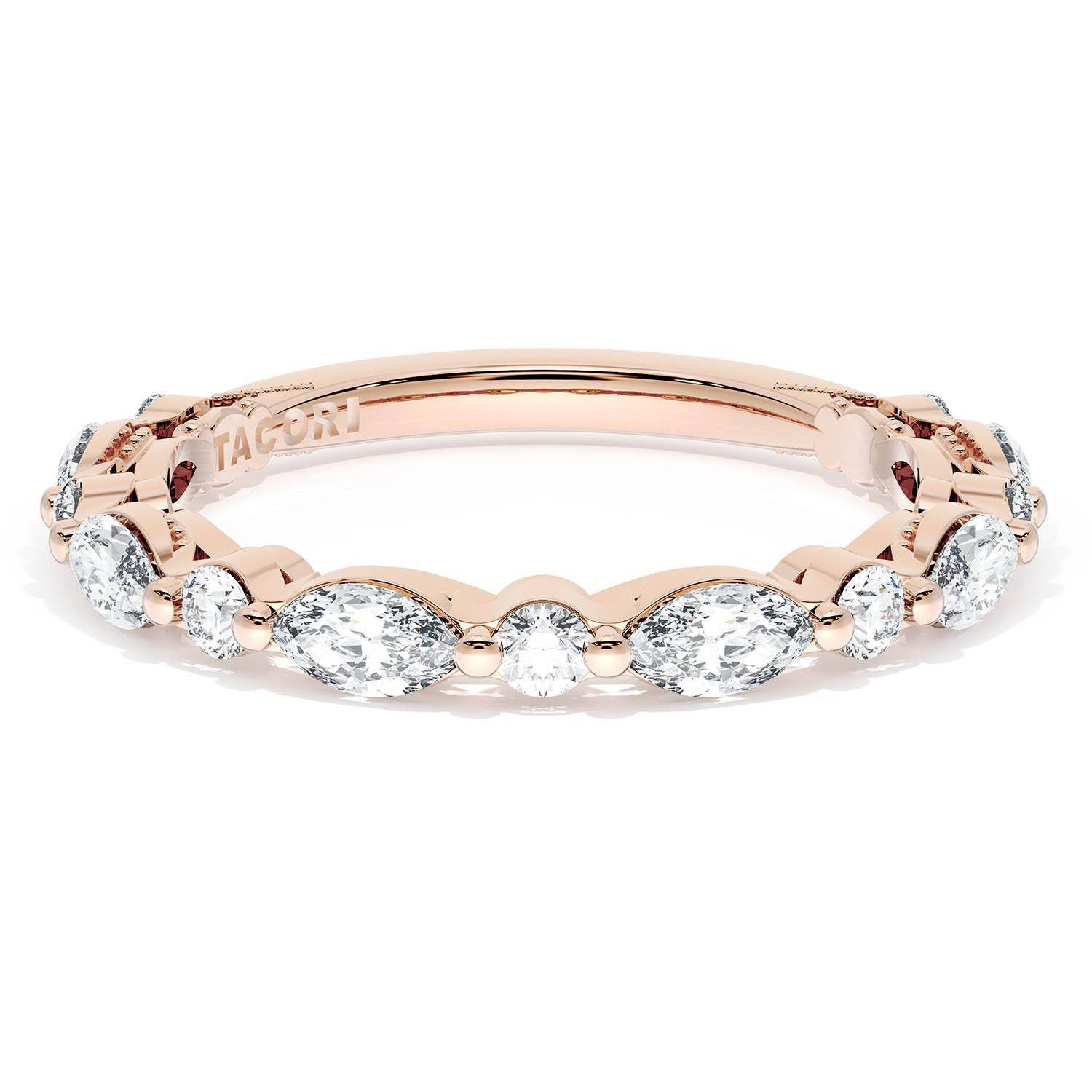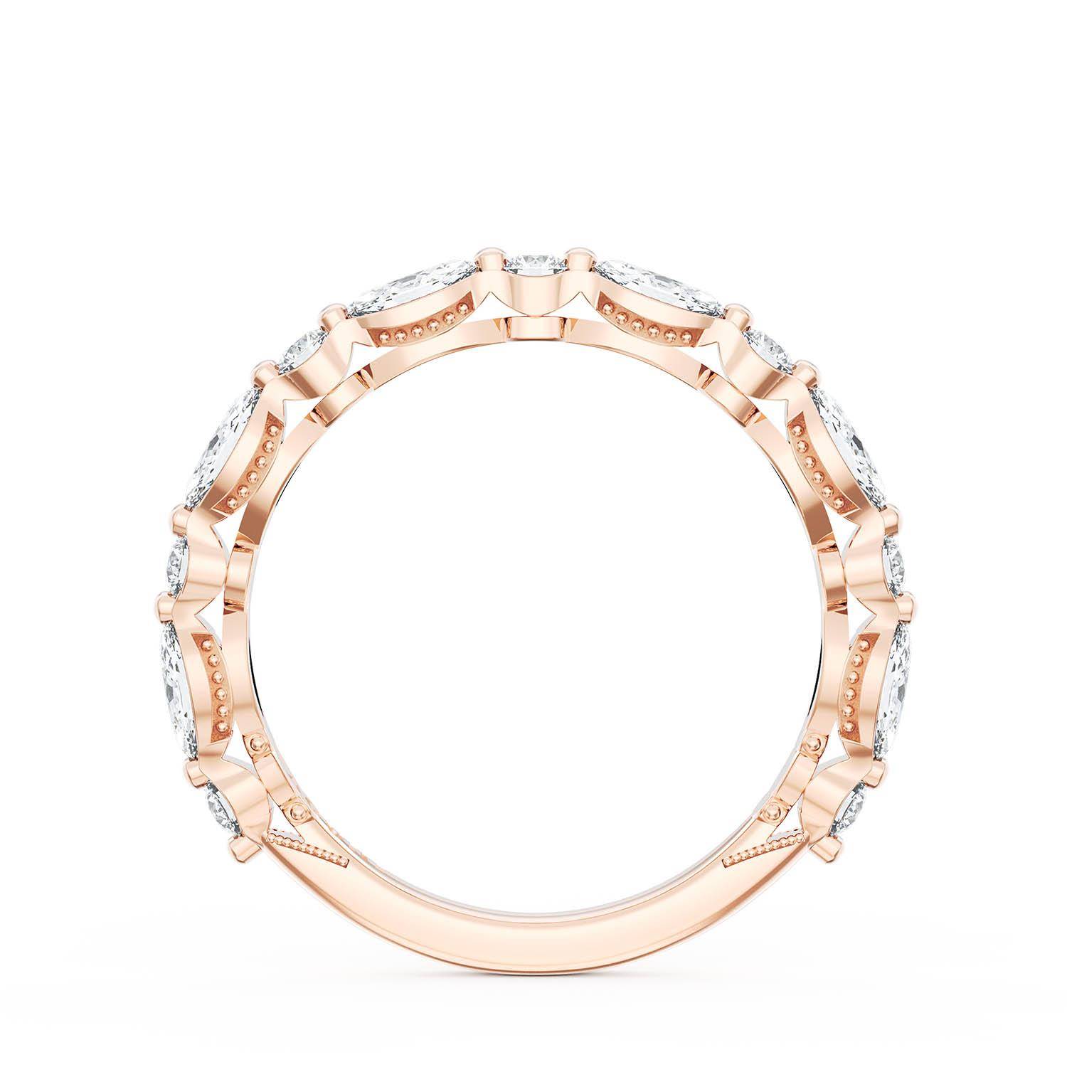 Alternating marquise and round brilliant diamonds are bezel set into a high polish 18kt Rose Gold band. Hand-hewn beading and meticulous milgrain add texture to the inner face silhouette.