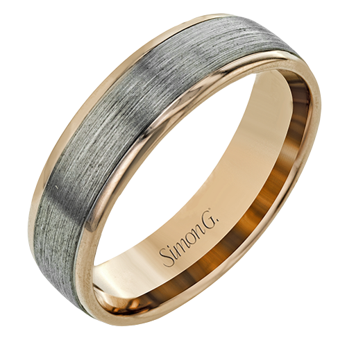 This 14k two-toned gold mens band is a fresh twist on a timeless look, with brushed gray gold in the center and high polish rose gold edges.