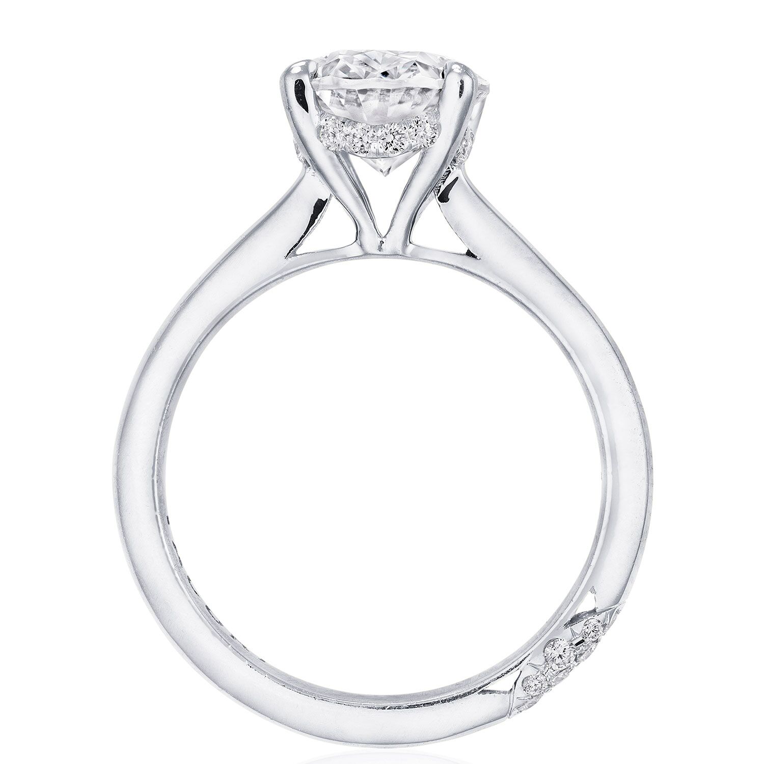Designed by our Founder, Haig Tacorian, this stunning four-prong, solitaire engagement ring features a oval-cut center stone on a high-polished band. Discover the hidden bloom of diamonds underneath the crown and the diamond-studded crescent signature at the foundation.