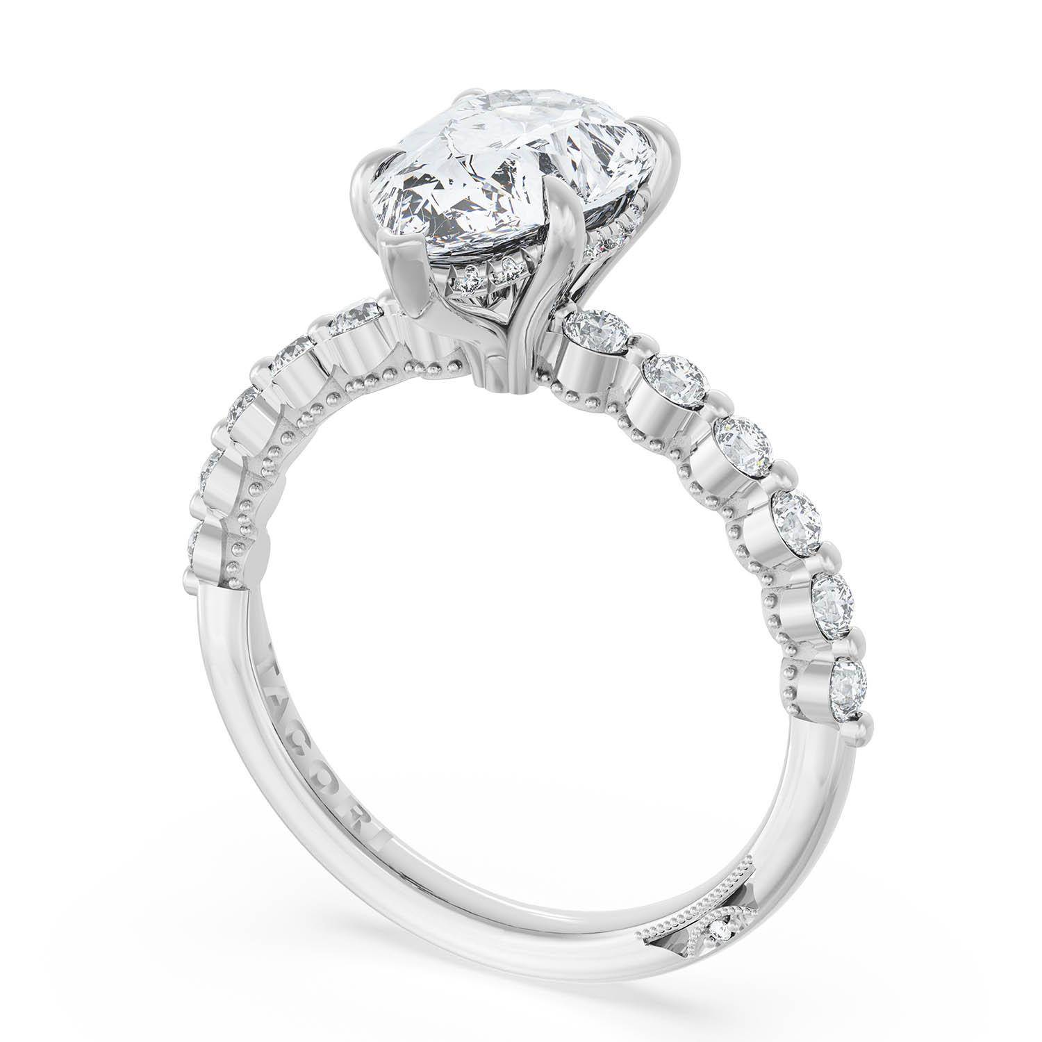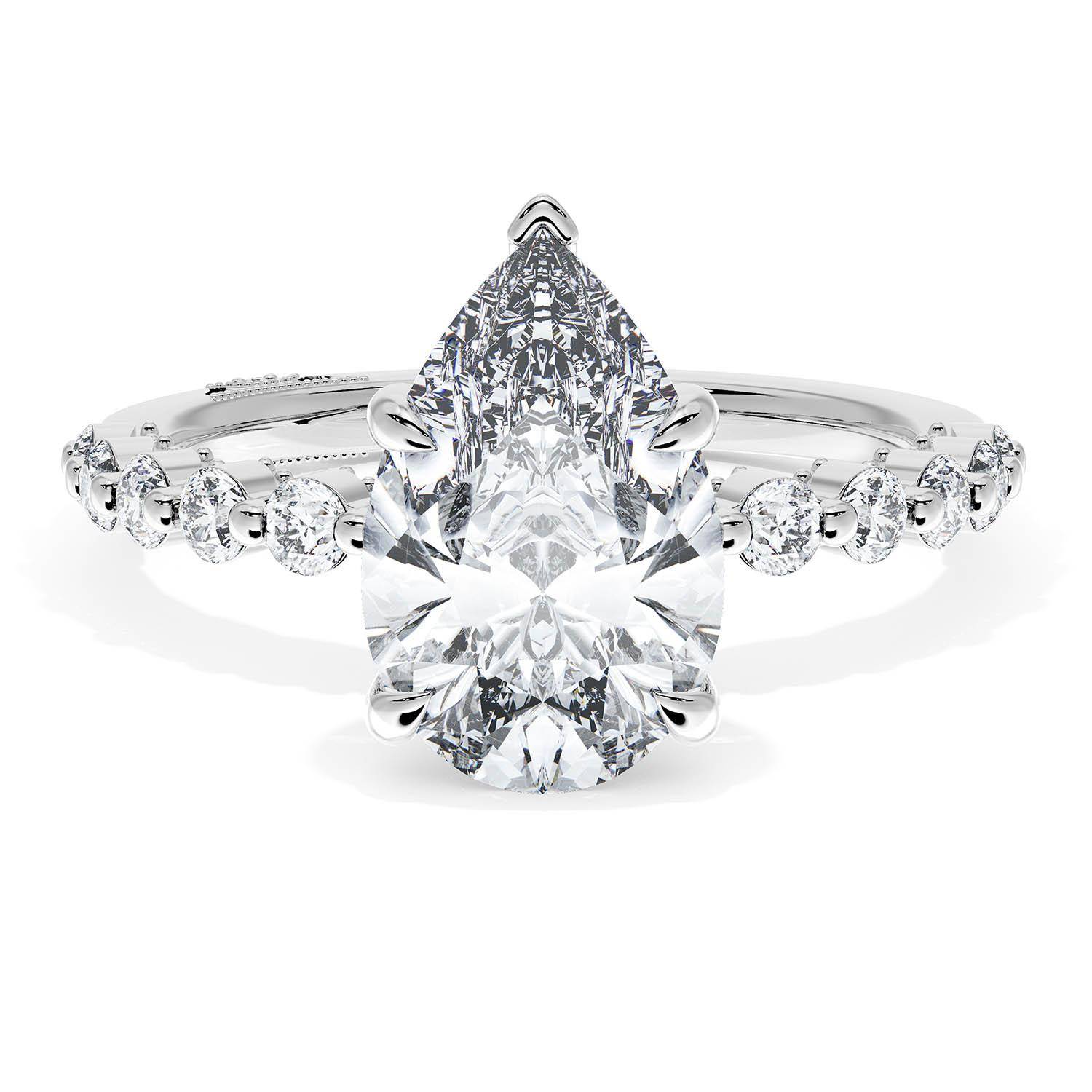 A Pear Solitaire is set into a Platinum foundation. Masterfully set round brilliant diamonds trace up the ceiling and hand-hewn beading adds texture to the silhouette.