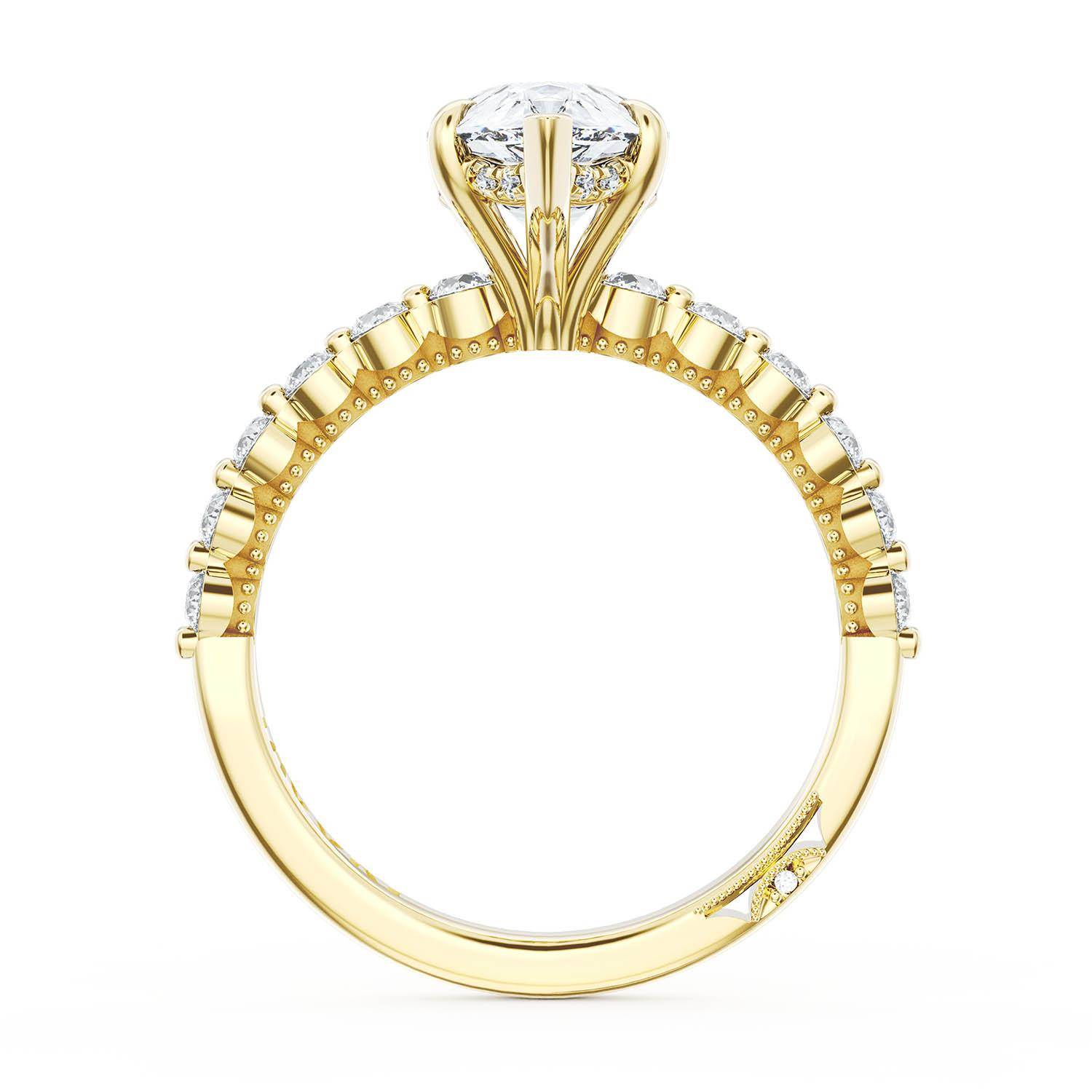 A Pear Solitaire is set into an 18kt Yellow Gold foundation. Masterfully set round brilliant diamonds trace up the ceiling and hand-hewn beading adds texture to the silhouette.