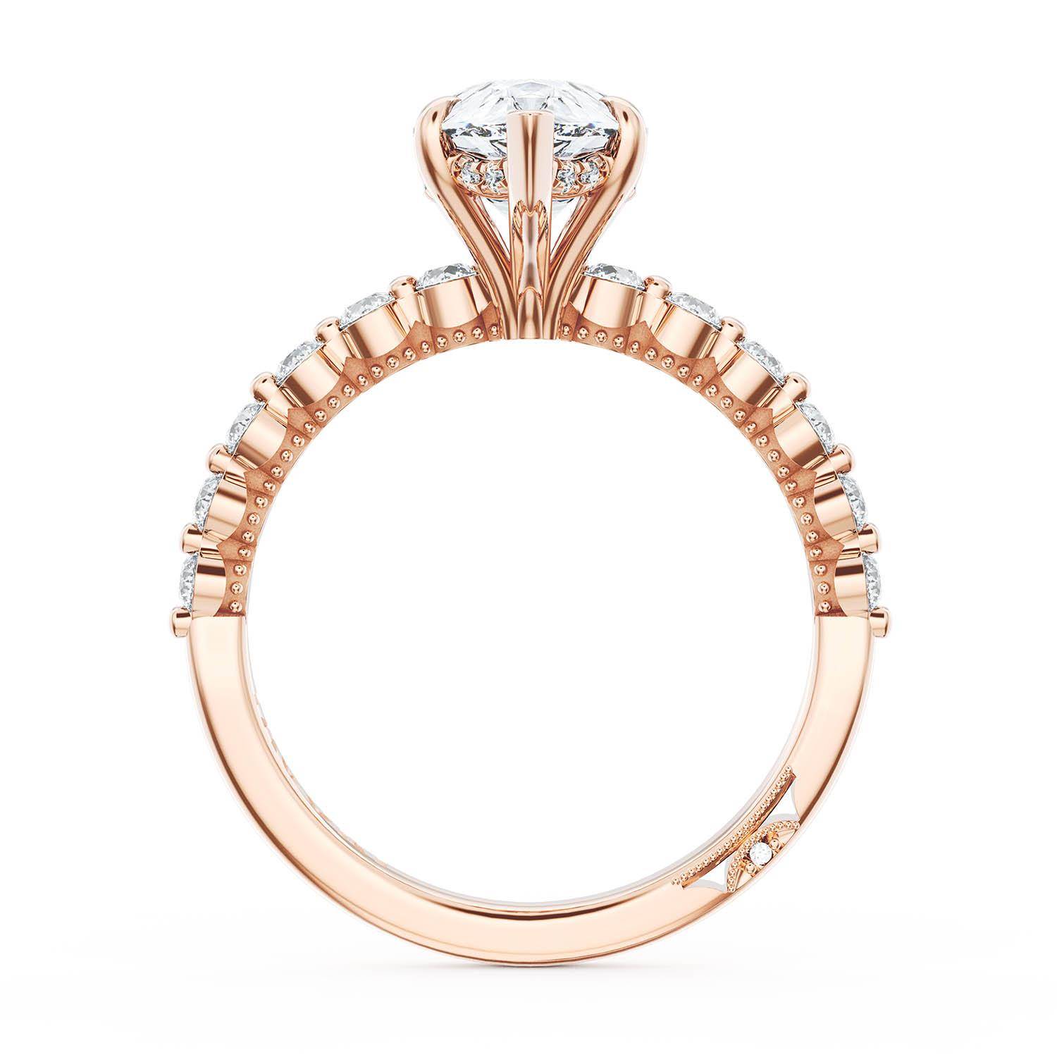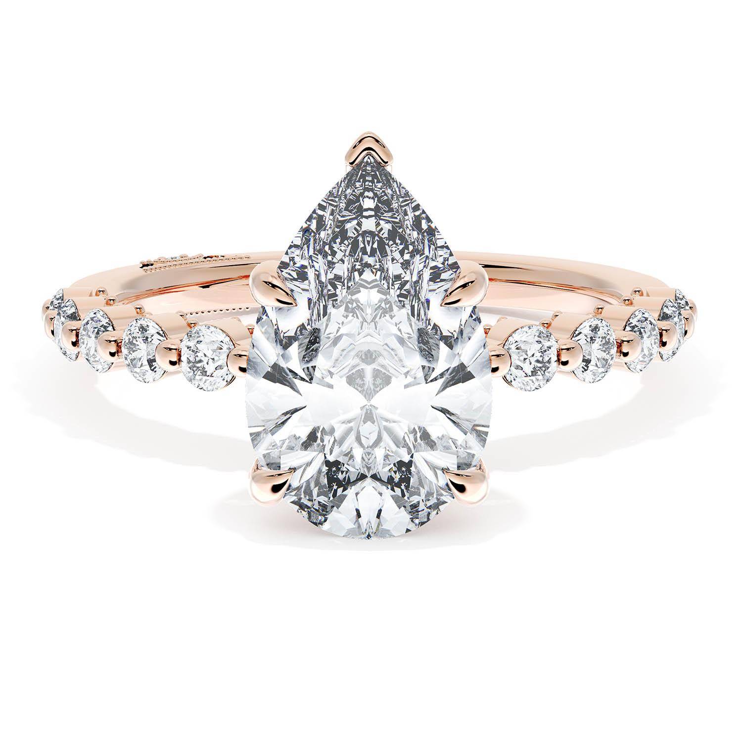 A Pear Solitaire is set into an 18kt Rose Gold foundation. Masterfully set round brilliant diamonds trace up the ceiling and hand-hewn beading adds texture to the silhouette.