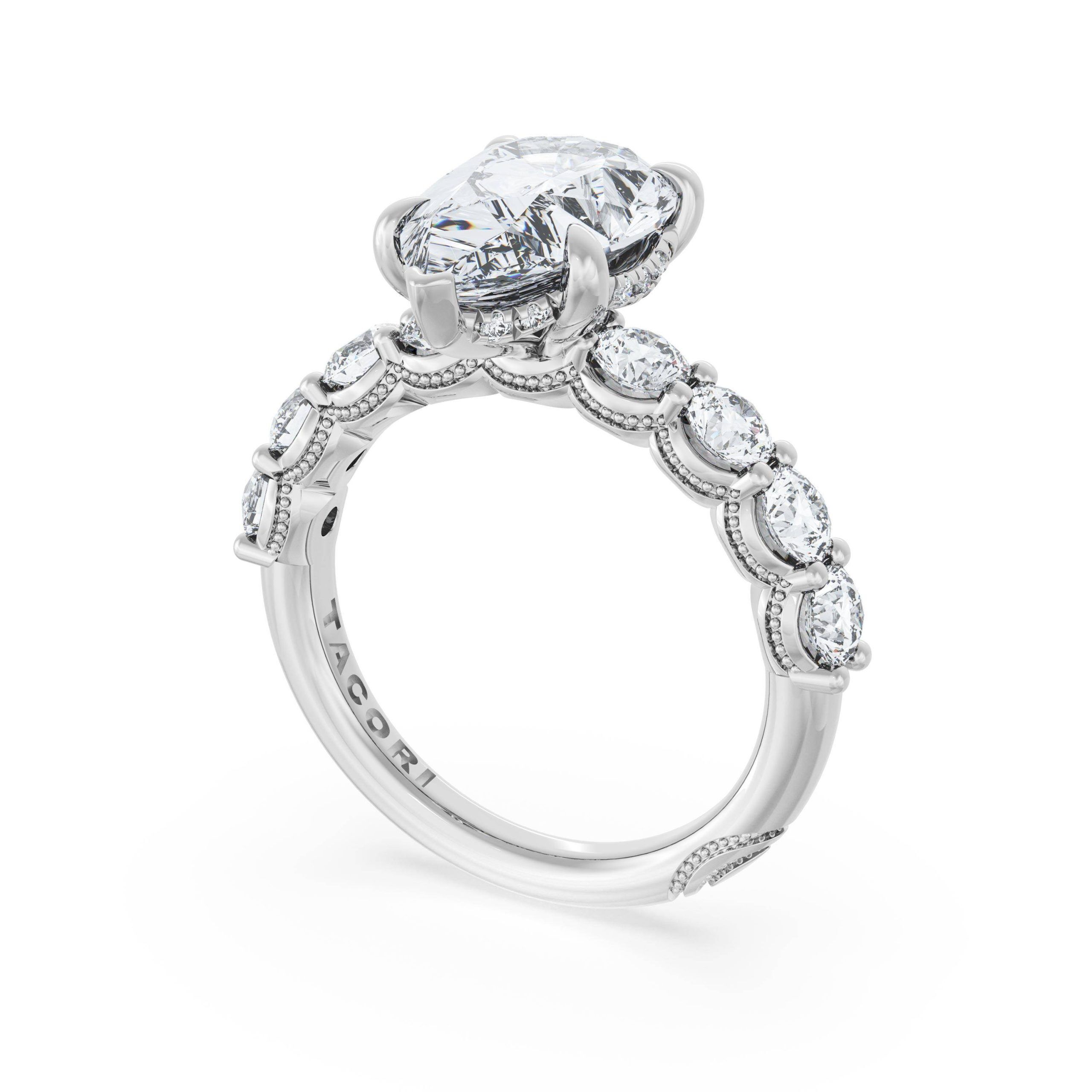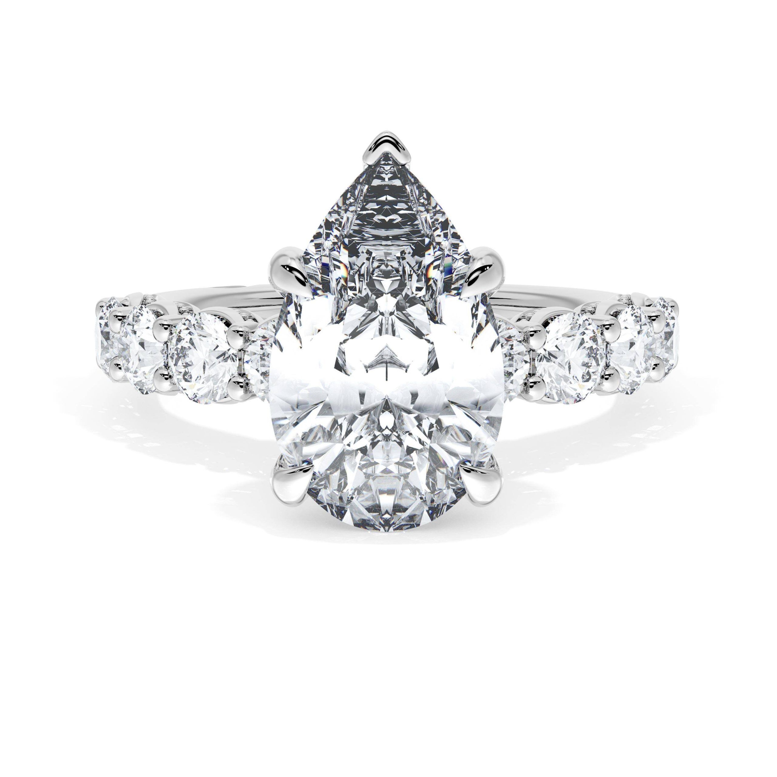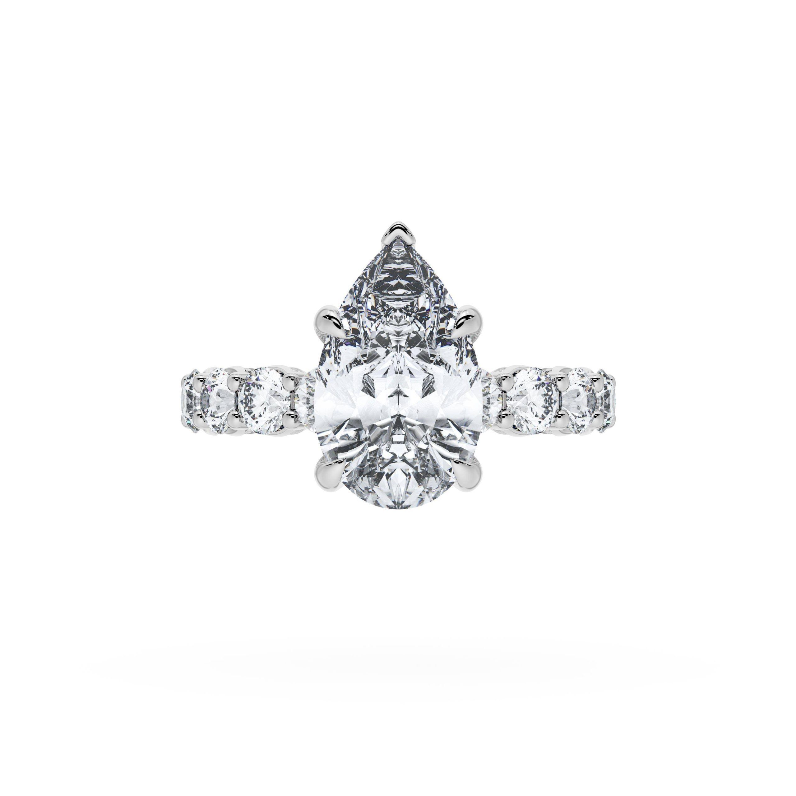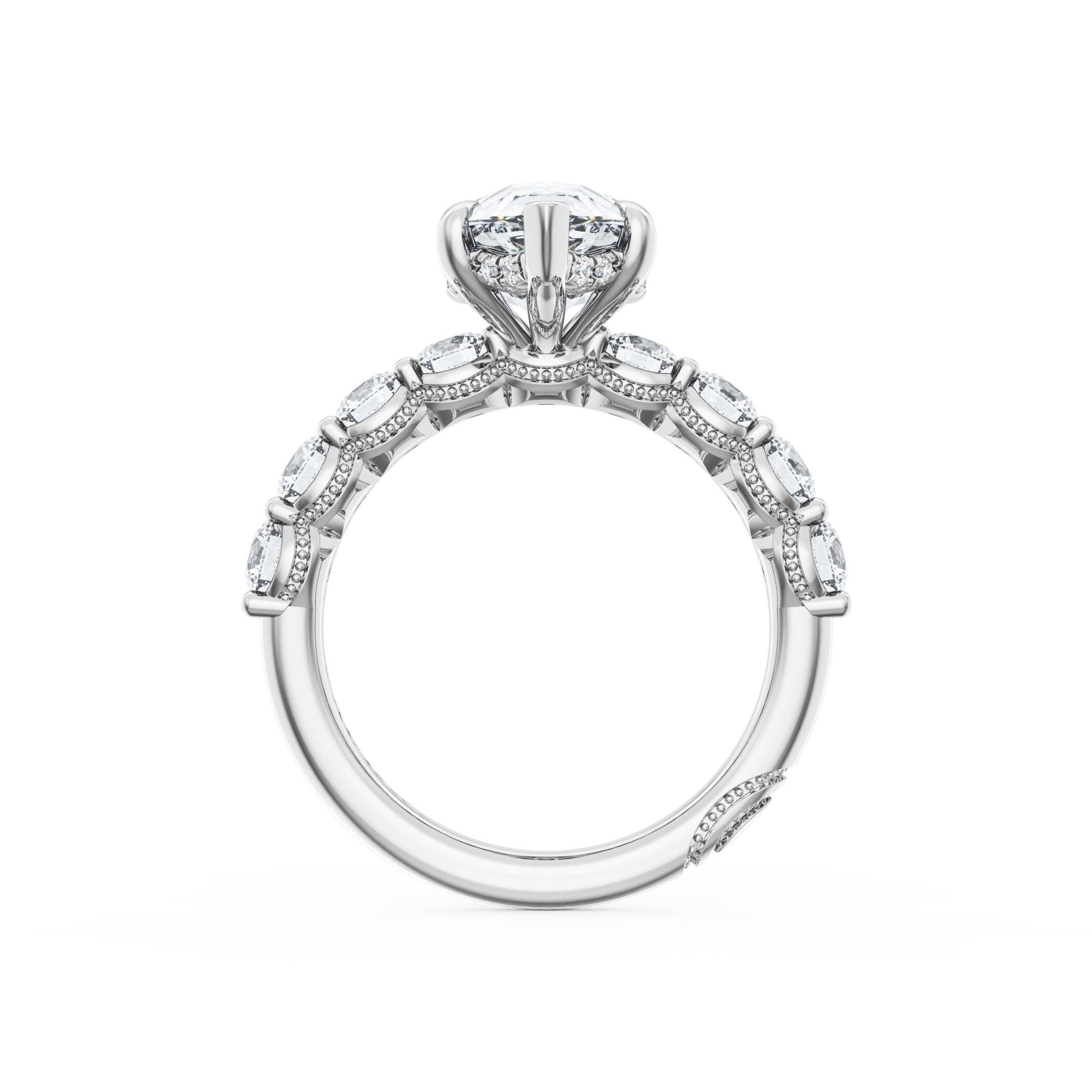 Eight round brilliant side stones decorate the ceiling of this Pear cut solitaire. A hidden bloom and milgrain Crescents on the silhouette add hidden detail.