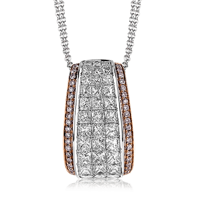 The lovely contemporary design of this white and rose gold pendant is enhanced by the presence of .14 ctw round cut pink diamonds complemented by 1.42 ctw princess cut white diamonds.