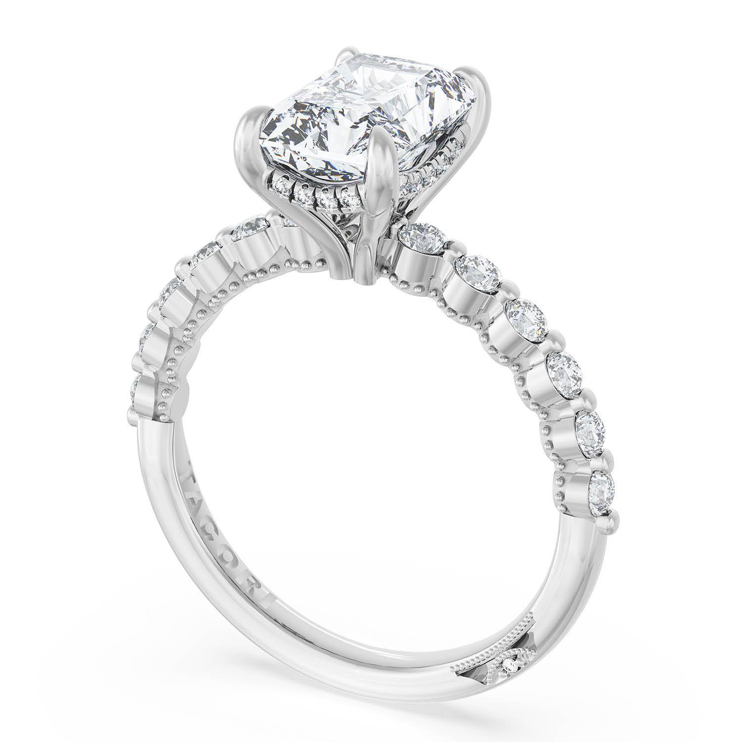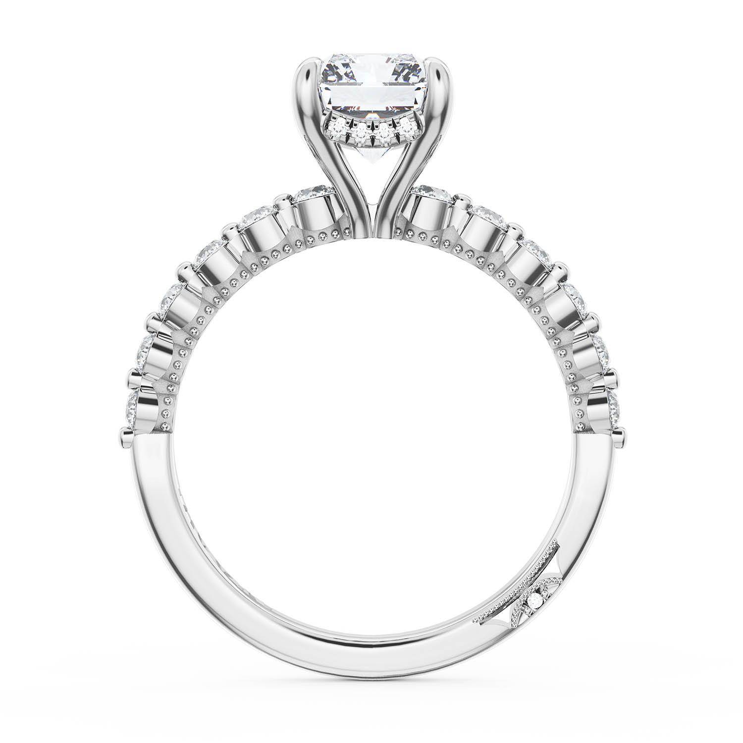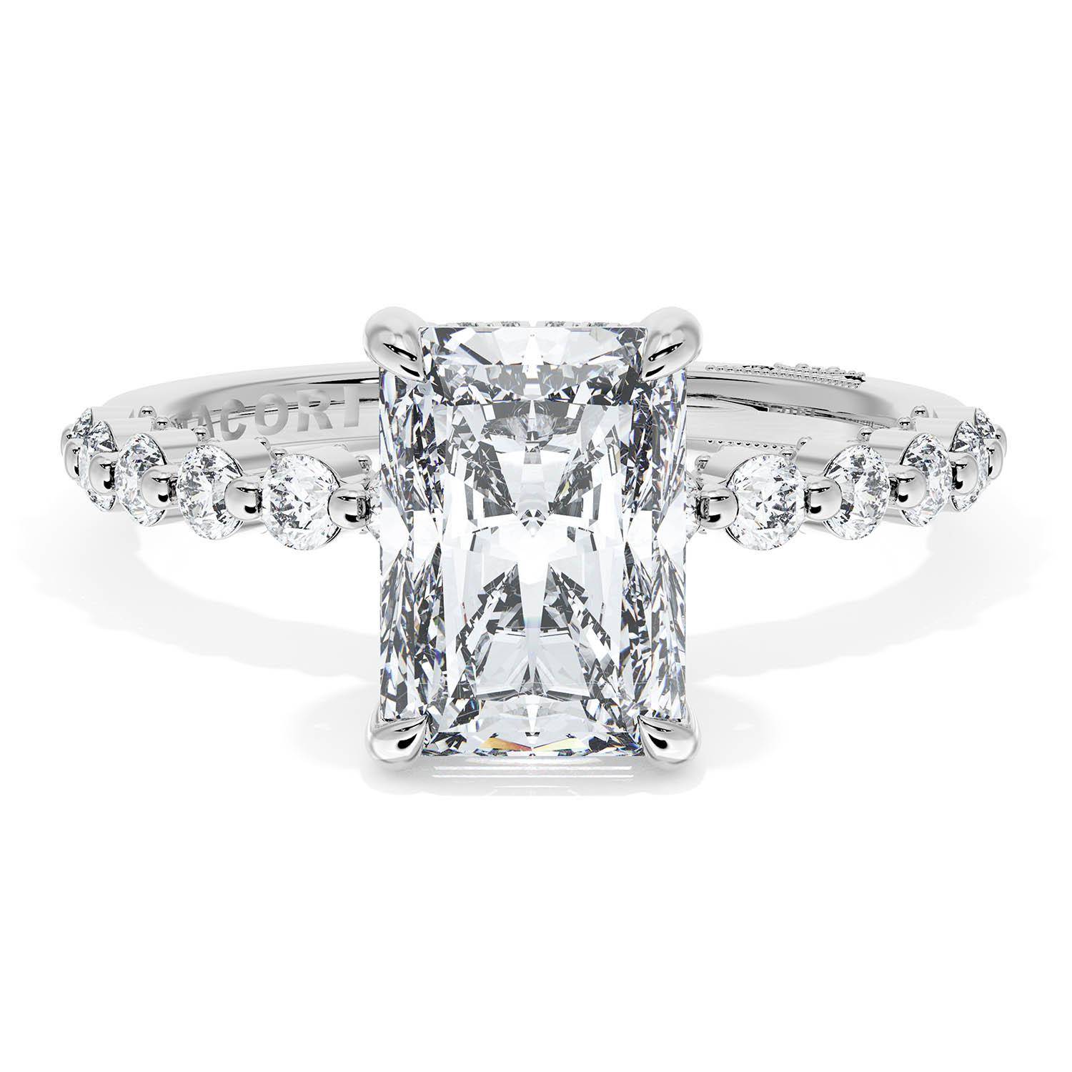 A Radiant Solitaire is set into an 18kt White Gold foundation. Masterfully set round brilliant diamonds trace up the ceiling and hand-hewn beading adds texture to the silhouette.