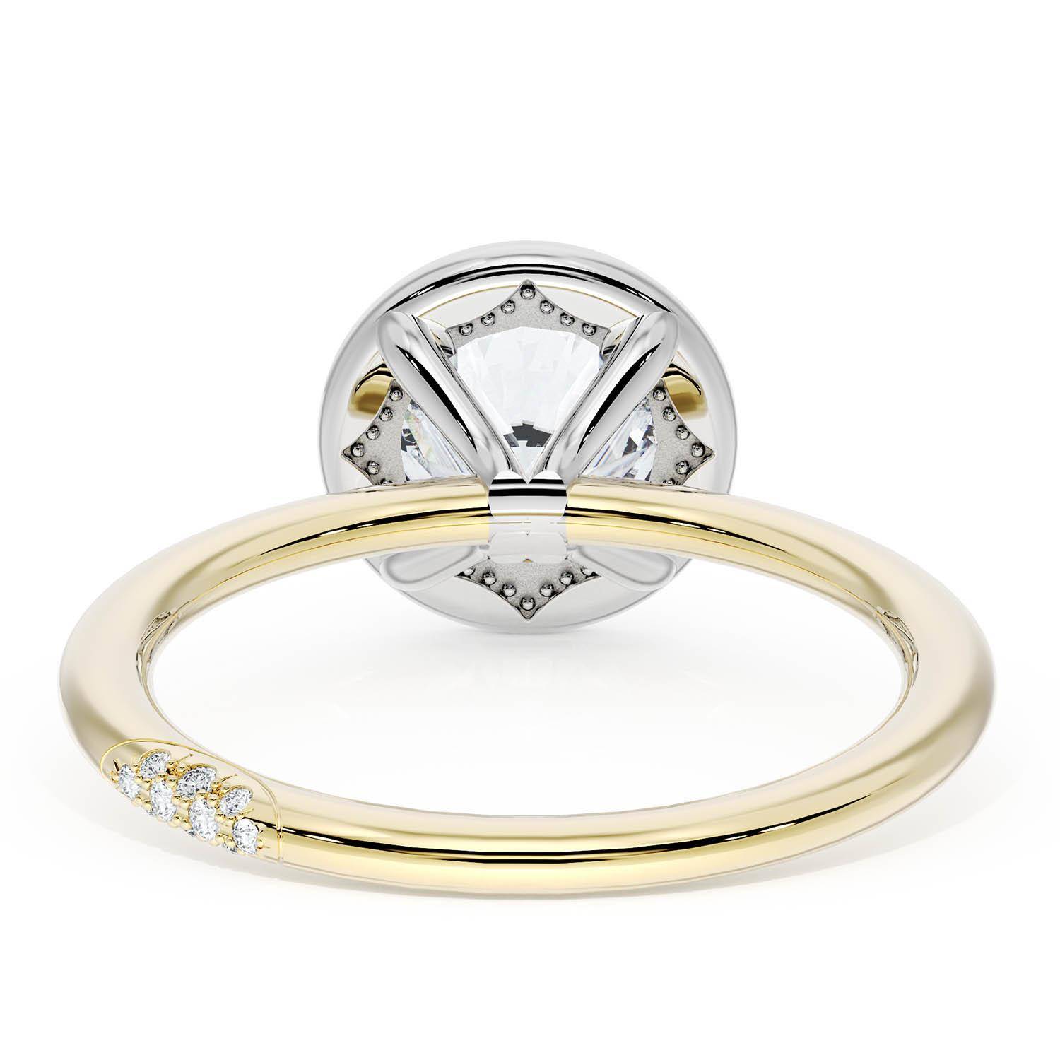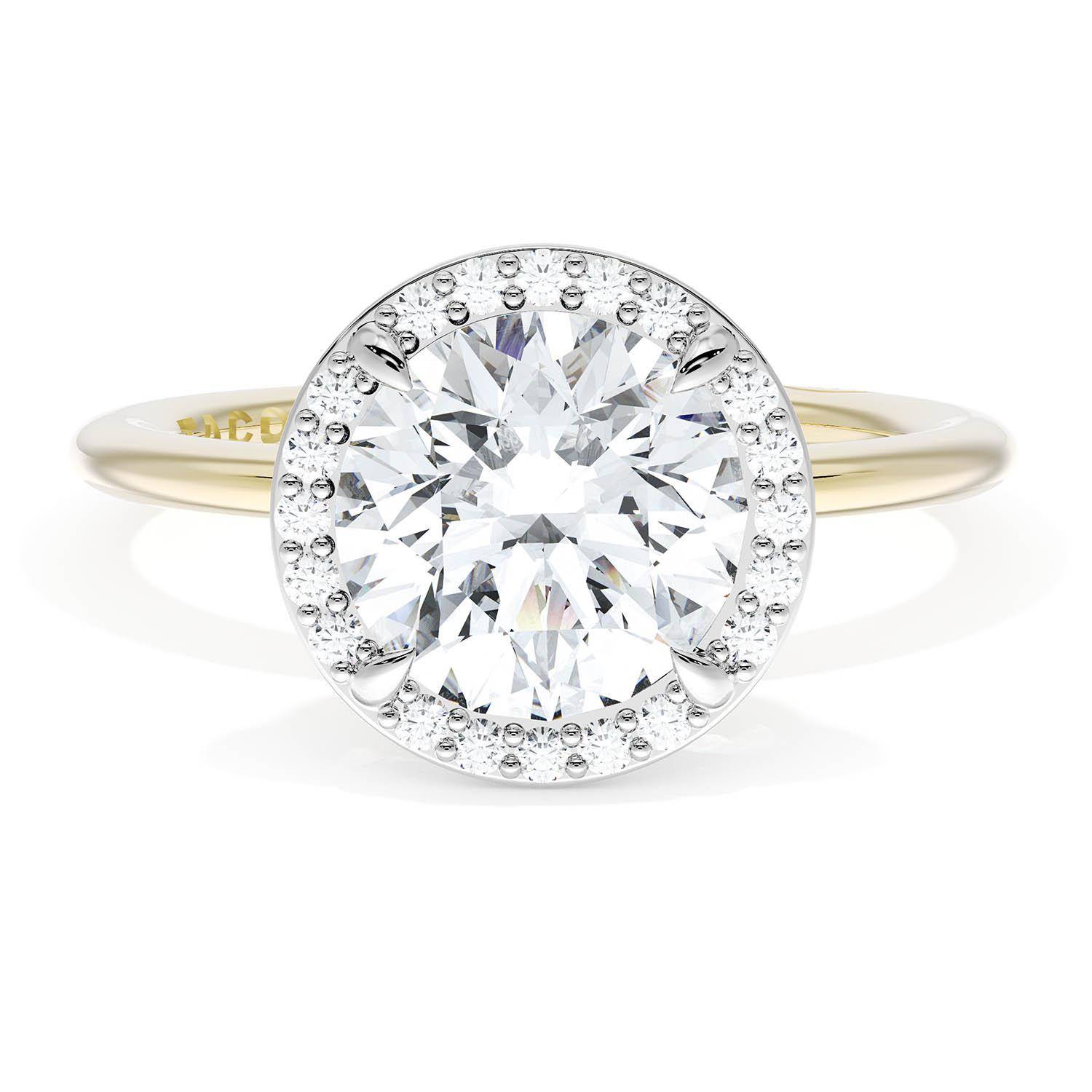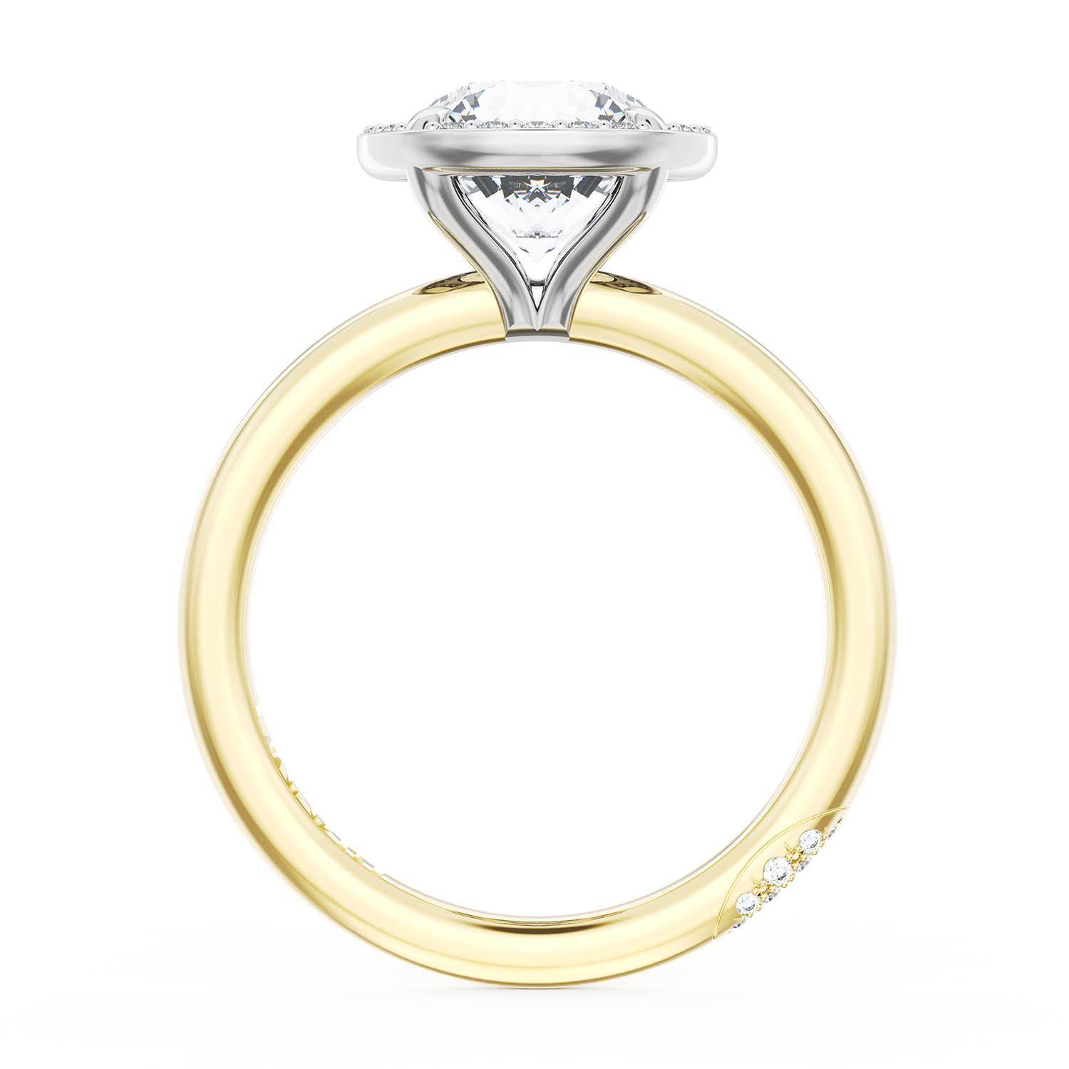 A Round solitaire is elevated by a modern bloom of round brilliant diamonds, and set into a two tone 18kt Yellow and White Gold foundation. TACORI Crescents add hidden detail to the underside of the crown.
