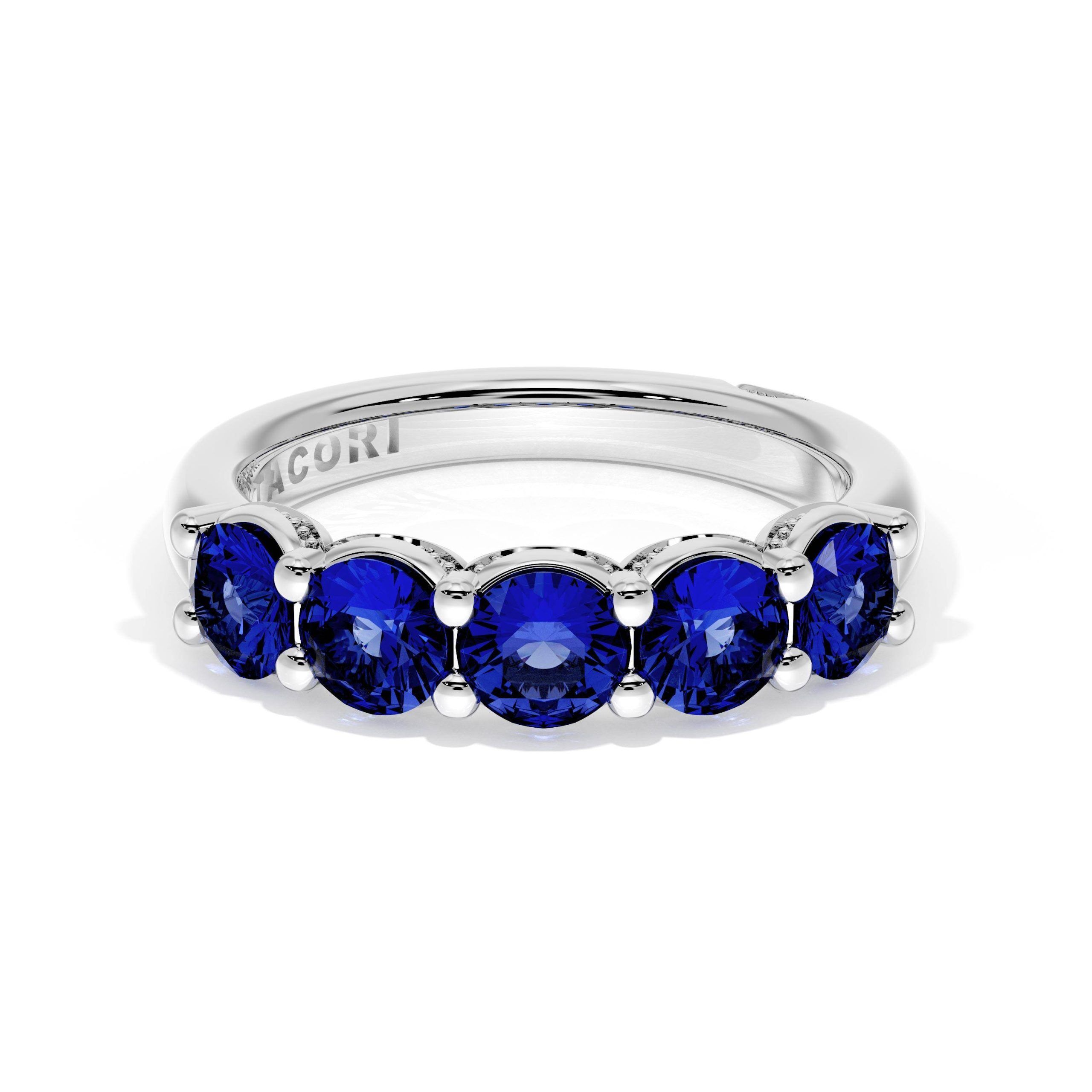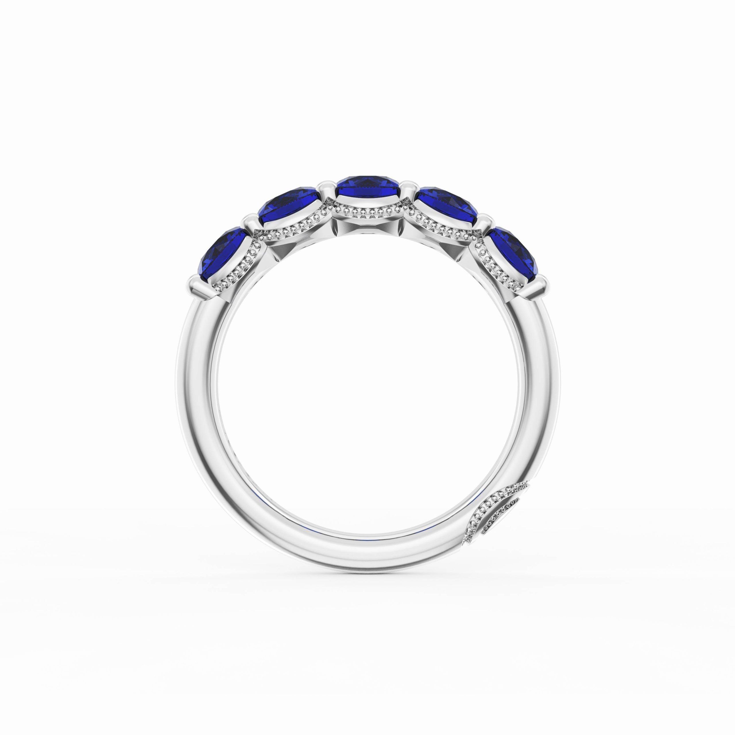 Round cut blue sapphires decorate the ceiling of this band and milgrain adds intricate texture to the silhouette.