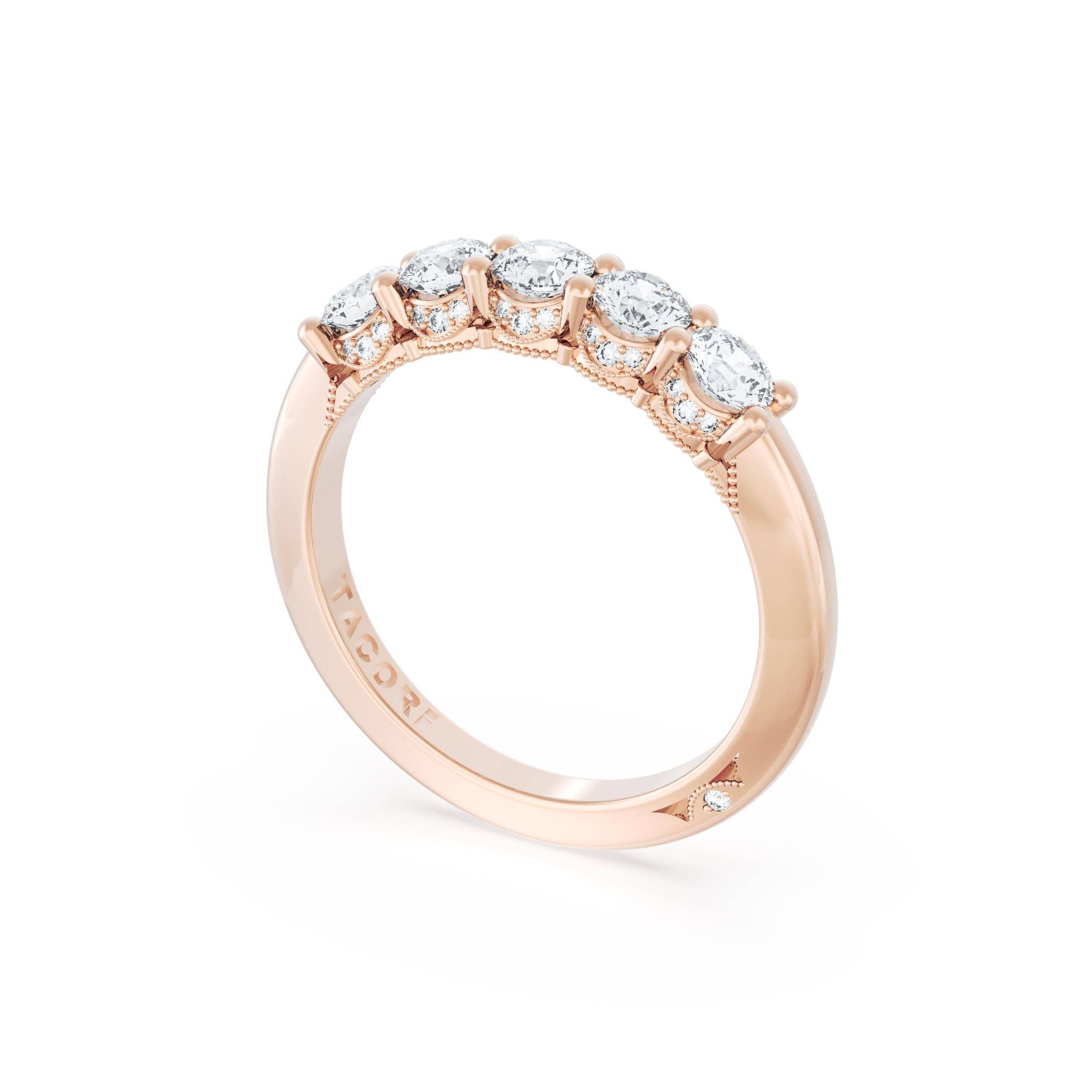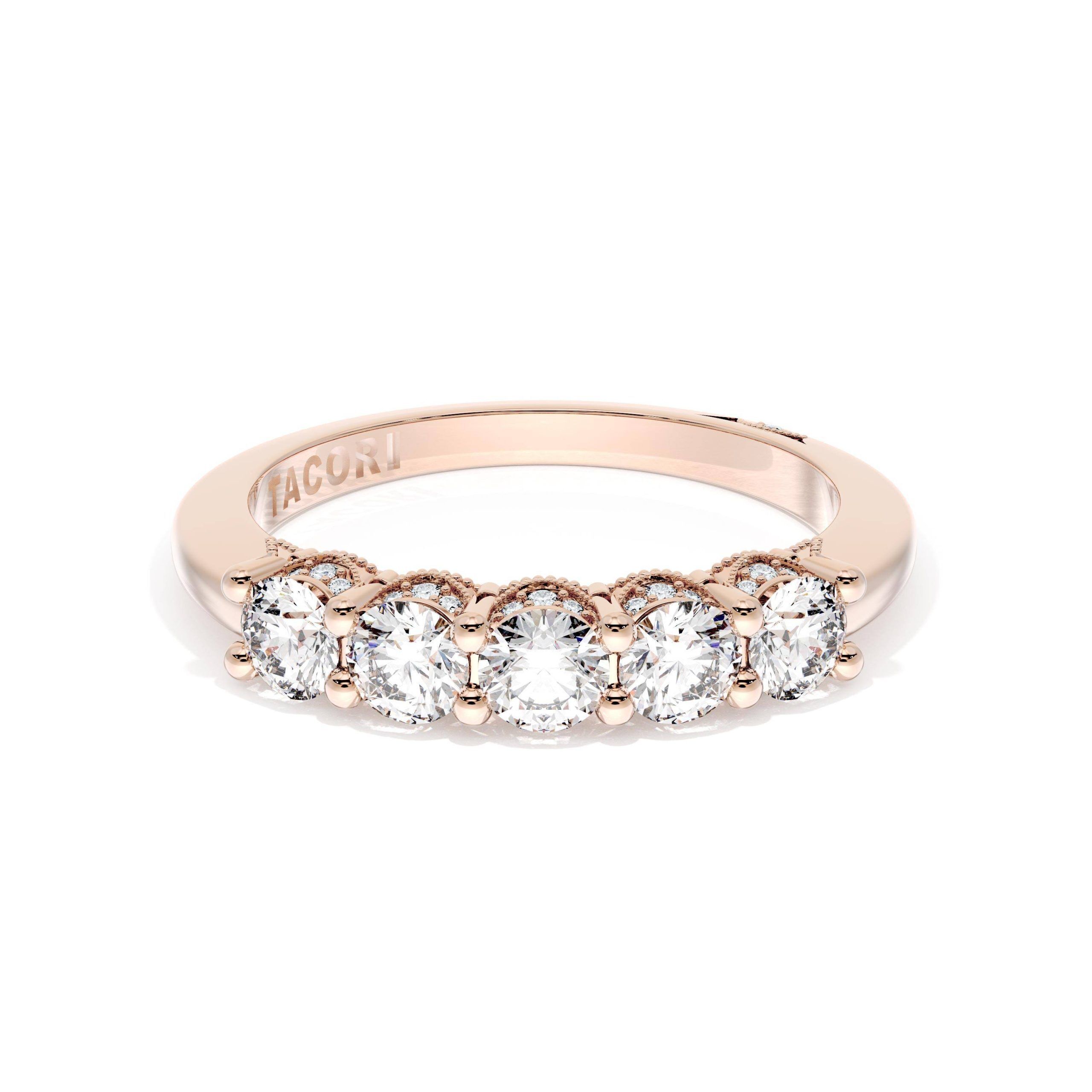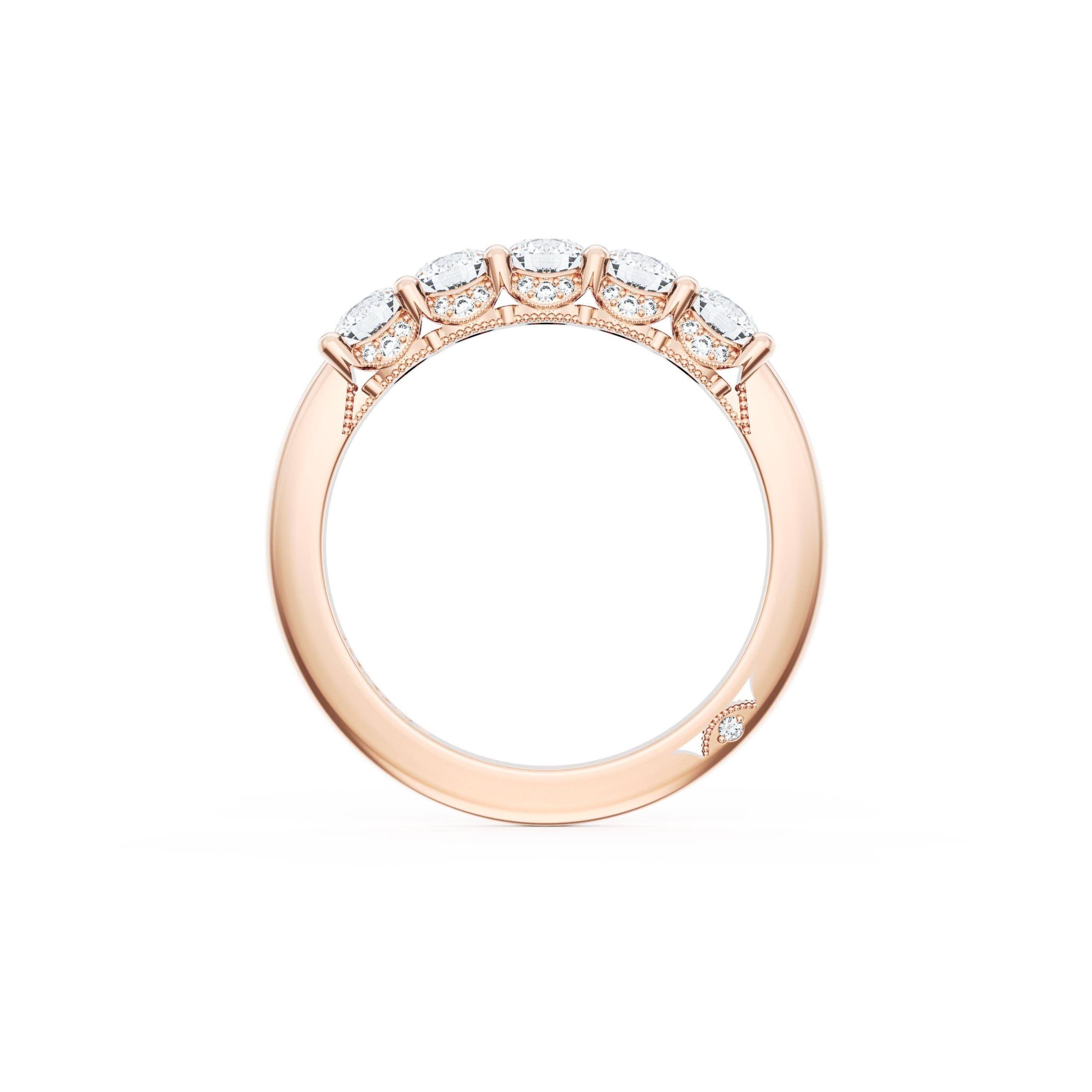 Five hand-selected round brilliant diamonds decorate the ceiling of this 18kt Rose Gold band. Diamond-studded Crescents decorate the inner face.