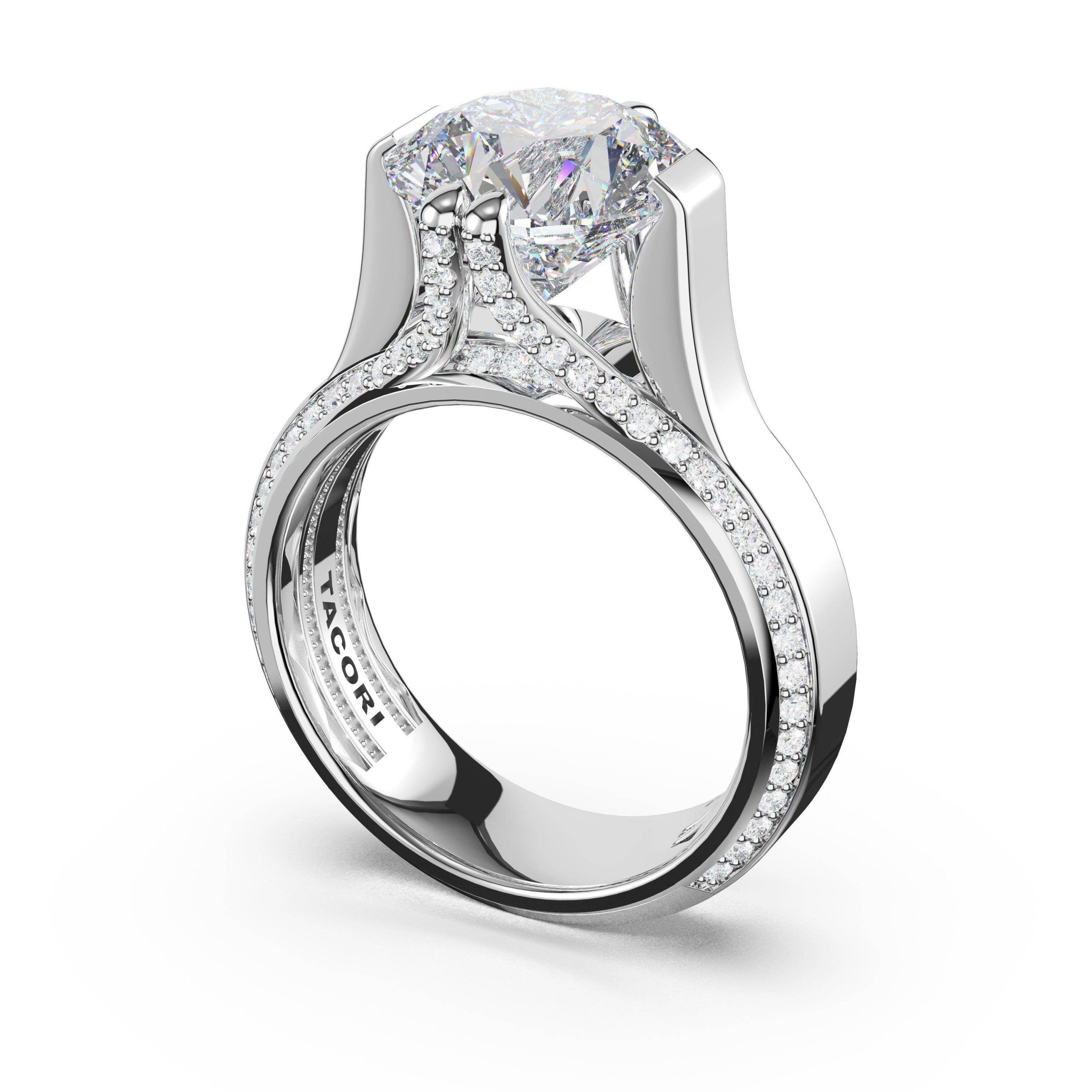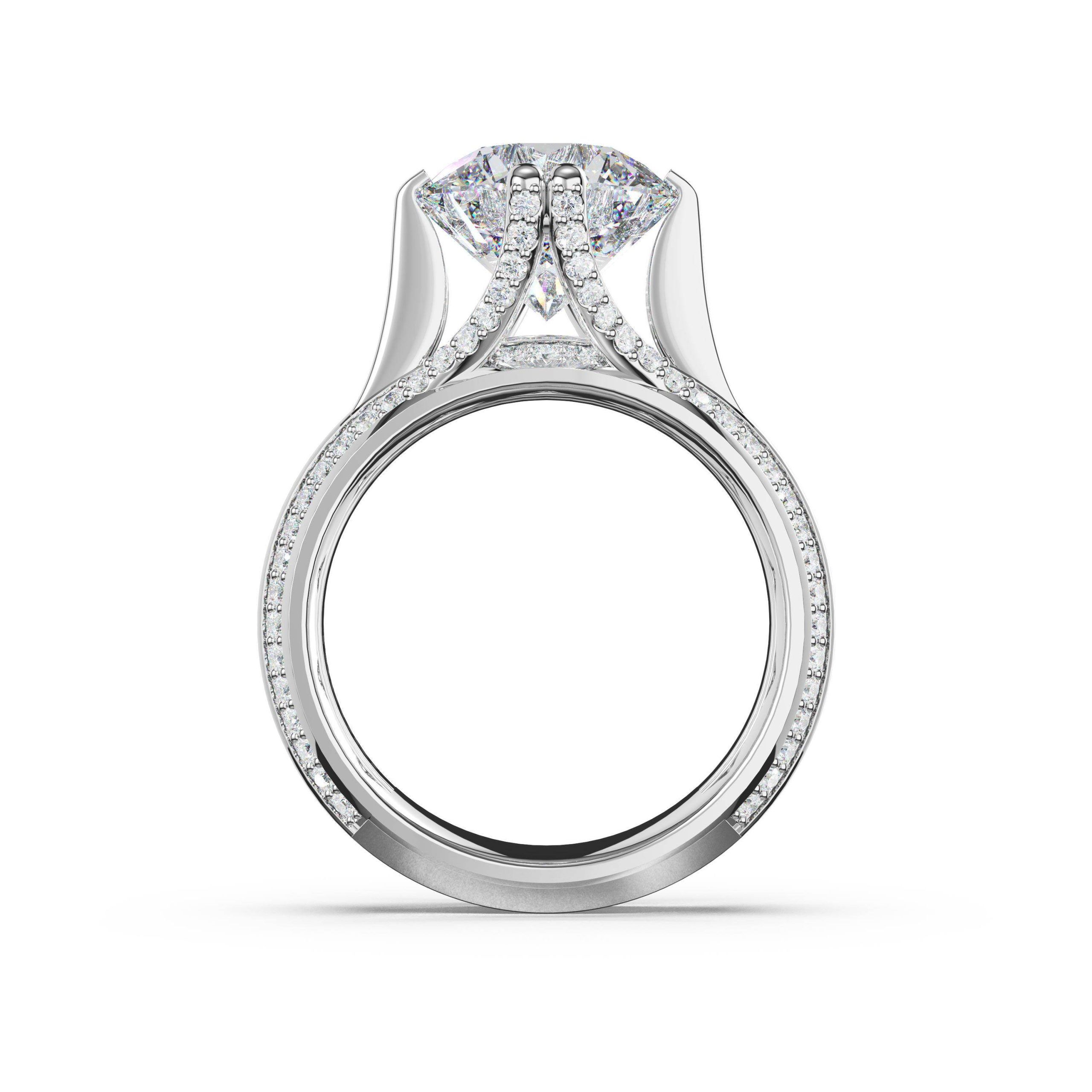 Pavé-set split prongs secure a round-cut diamond atop a wide foundation, making a bold statement. The pavé continues along three-quarters of the foundation on both edges, creating continuous sparkle and refined presence.