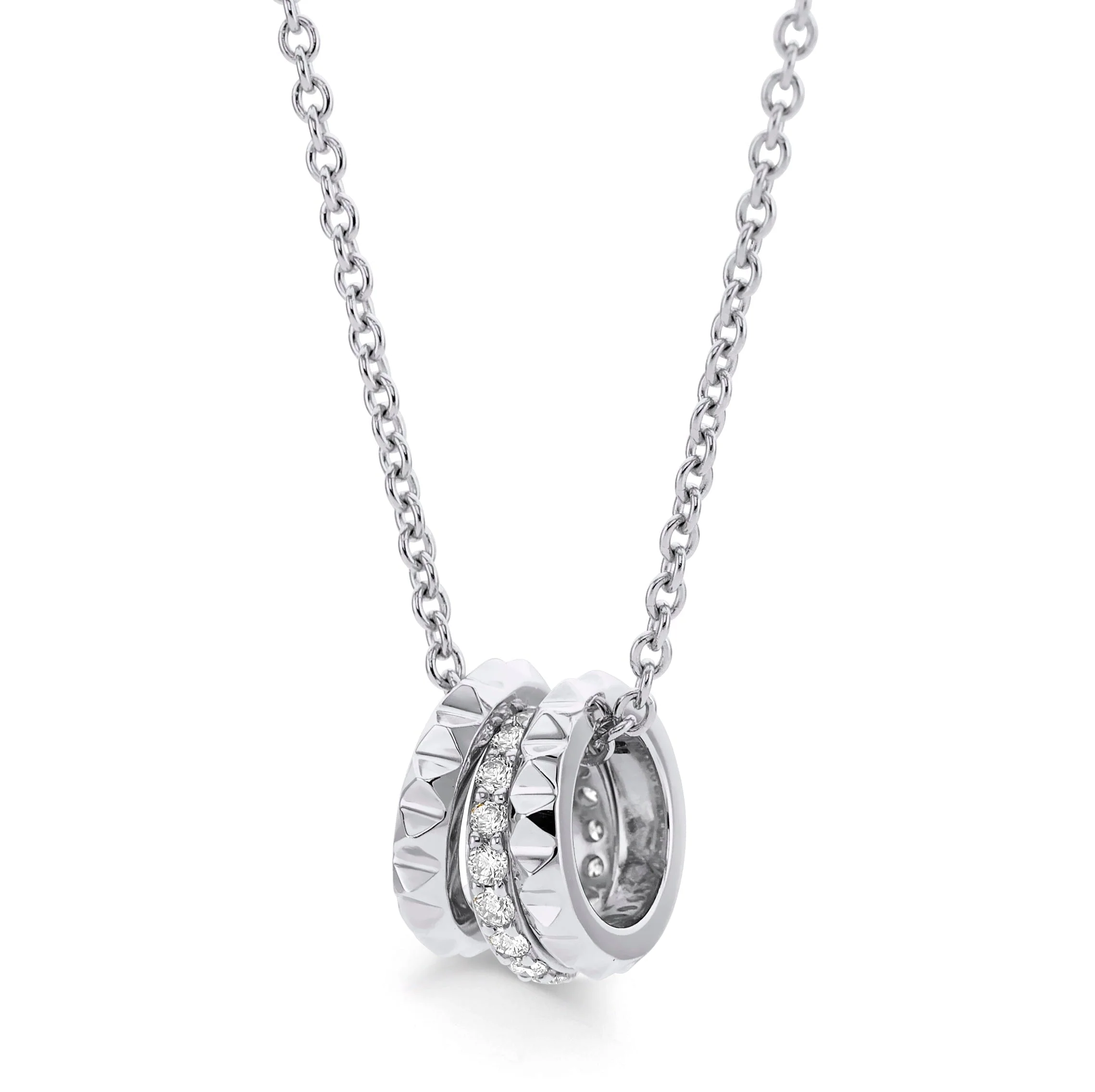 Three ring charms created the movement for the Tetra Triple Ring Necklace. The center ring adds sparkling pave and the two outside rings have structured tiny pyramid studs.