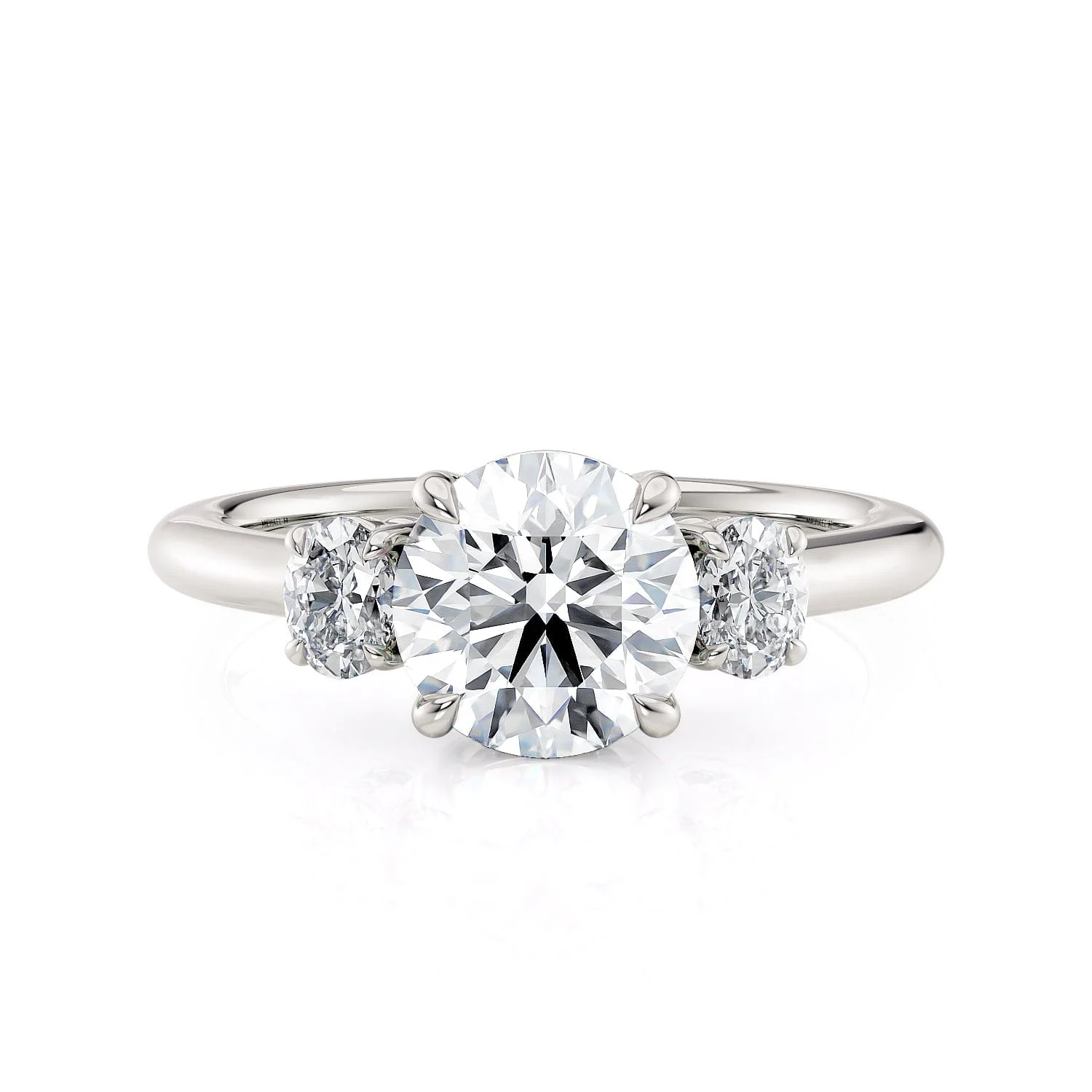 Our R806-1.5 engagement ring is a three stone ring that features round diamonds pave set under all three baskets and oval diamond side stones prong set. The meticulous detail and craftsmanship make this ring a showstopper. You can expect a timeless piece of fine jewelry that will last for generations.