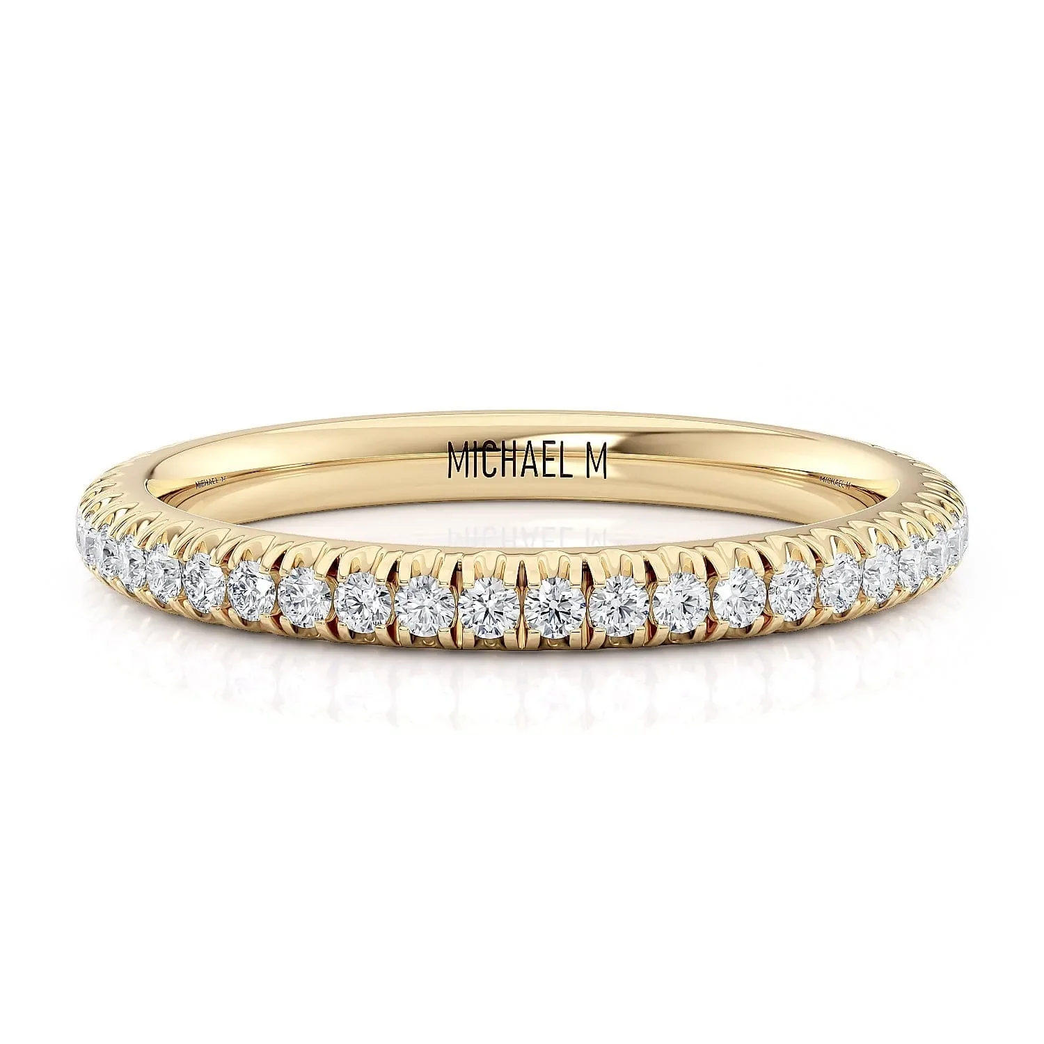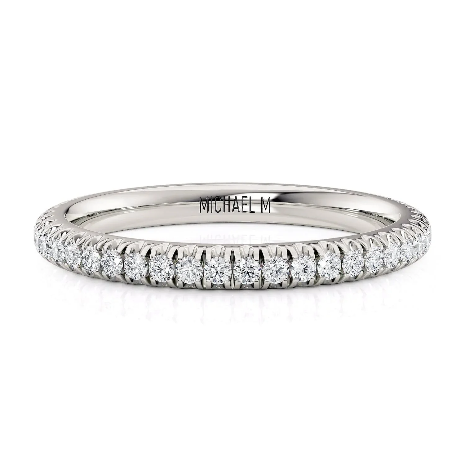 This Michael M ladies’ wedding band is adorned with brilliant round-shaped pave set diamonds, and are placed in a beautiful 3/4 way ring style. For any questions about this wedding band or other Michael M fine jewelry items, consult your local authorized Michael M retailer for more information.