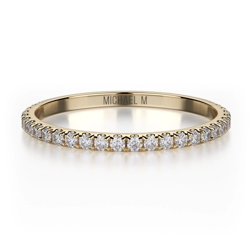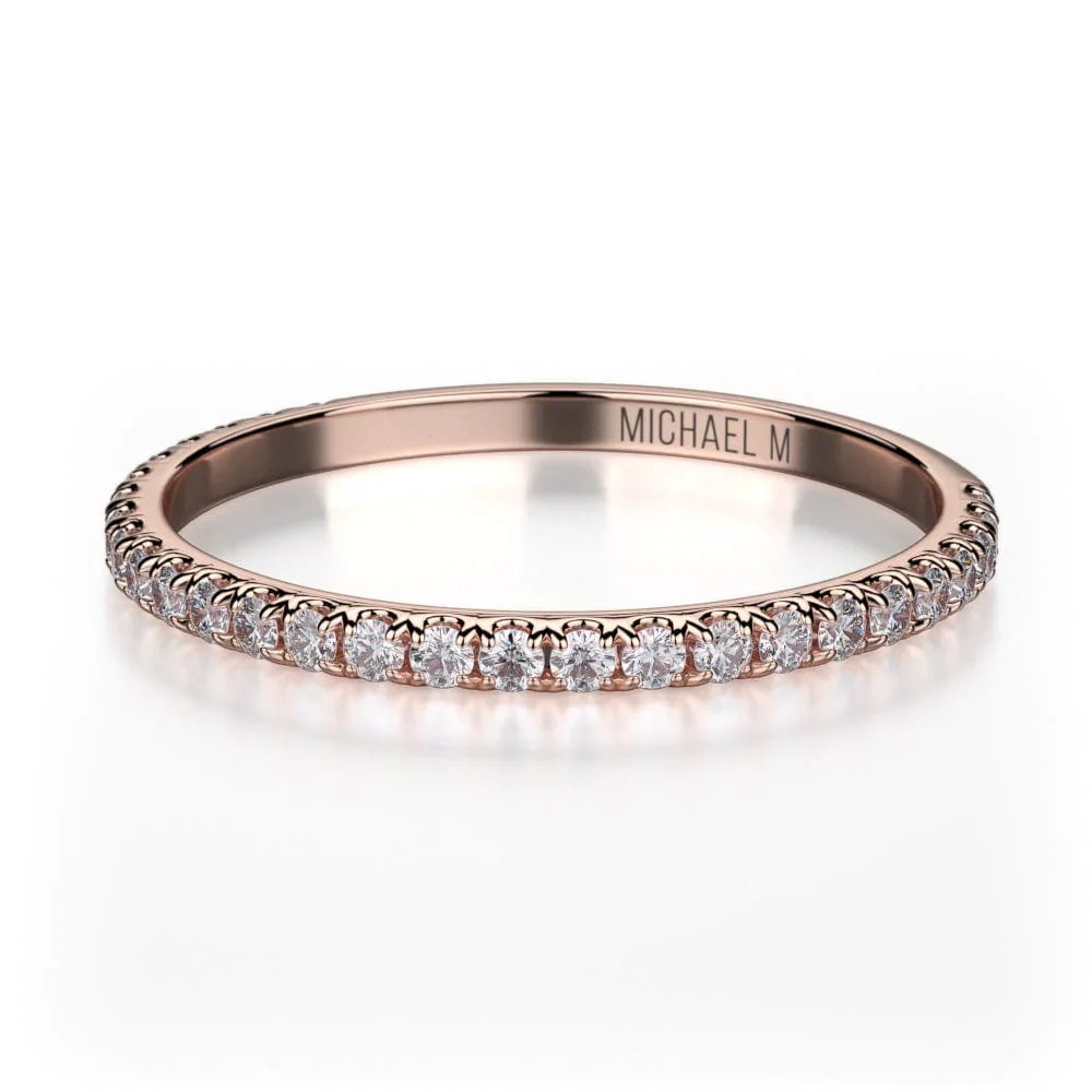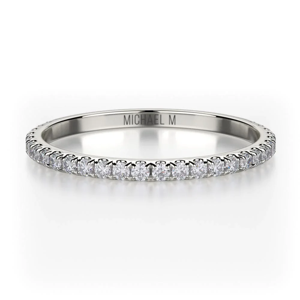 This Michael M ladies wedding band is adorned with brilliant round shaped prong set diamonds, and are placed in a beautiful ring style. For any questions about this wedding band or other Michael M fine jewelry items, consult your local authorized Michael M retailer for more information.