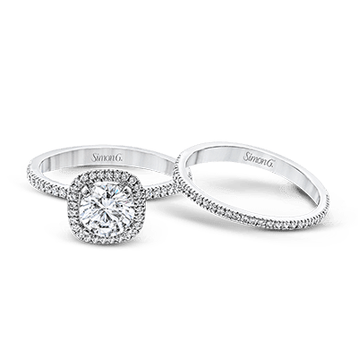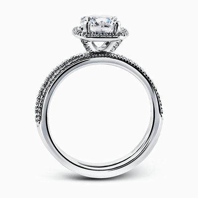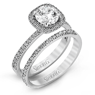 Accented by .46 ctw of glistening round cut white diamonds, this contemporary white gold halo style engagement ring and wedding band set makes a dramatic statement. Center stone not included. Our rings can be designed to fit any center stone.