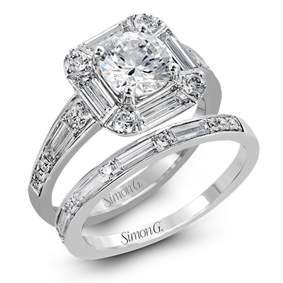 With a vintage touch, this stunning wedding set combines the understated elegance of baguette diamonds with the bright shine of round diamonds. Center stone not included. Our rings can be designed to fit any center stone.