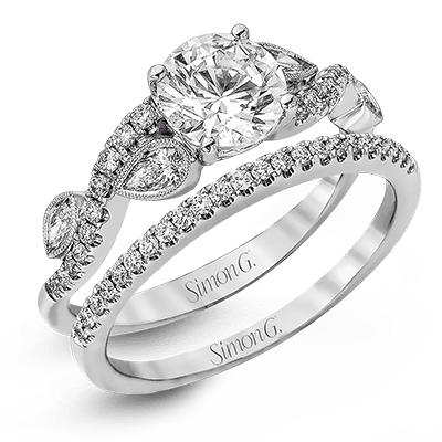Featuring a distinctively romantic design, this white gold engagement ring and band are set with .22 ctw of round cut white diamonds, .09 ctw of marquise cut diamonds, and .13 ctw pear-shaped diamonds. Center stone not included. Our rings can be designed to fit any center stone.