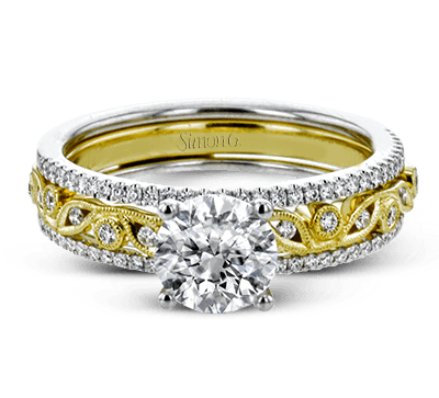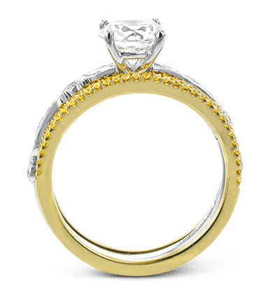This beautiful two-tone 18k gold wedding set features an organic design white gold inner ring, with a yellow gold jacket surrounding it that is set with .22 ctw of yellow diamonds. Center stone not included. Our rings can be designed to fit any center stone.