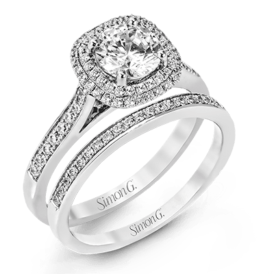 Showcasing a dazzling halo, this contemporary white gold wedding set is highlighted by .45 ctw of arresting round cut white diamonds. Center stone not included. Our rings can be designed to fit any center stone.